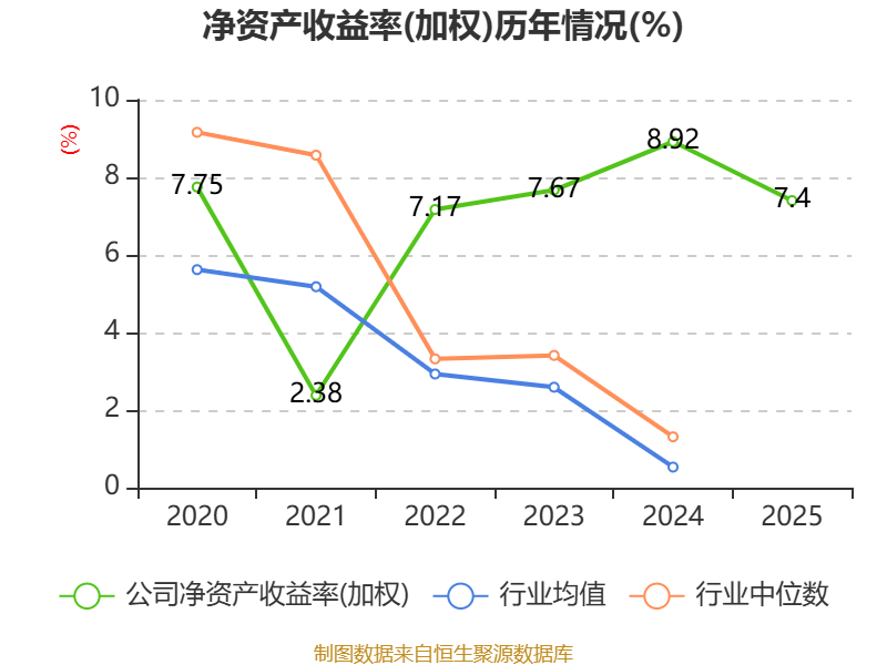 数据显示,2025年公司加权平均净资产收益率为7.4%,较上年同期下降1.52个百分点。公司2025年投入资本回报率为7.29%,较上年同期下降1.12个百分点。