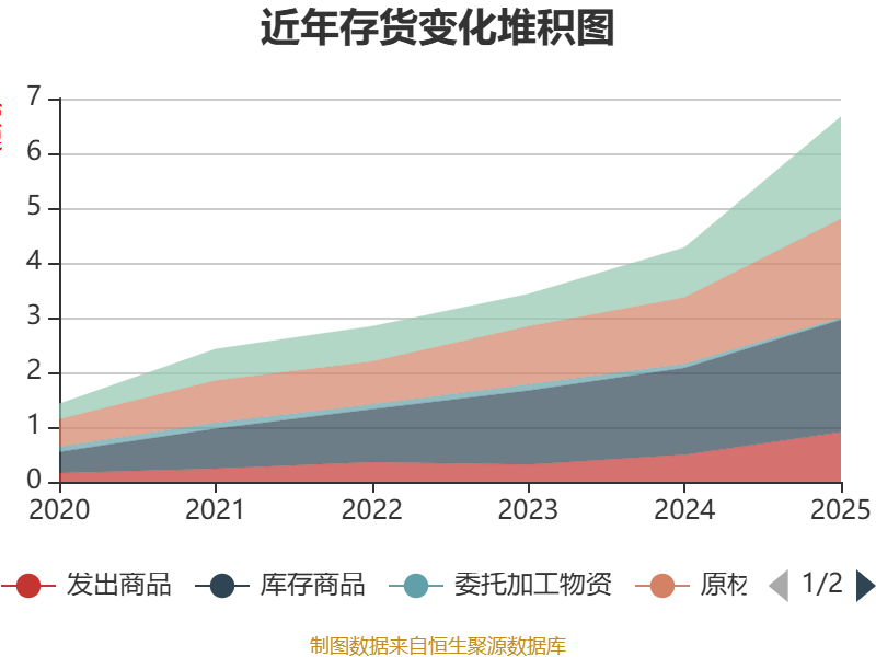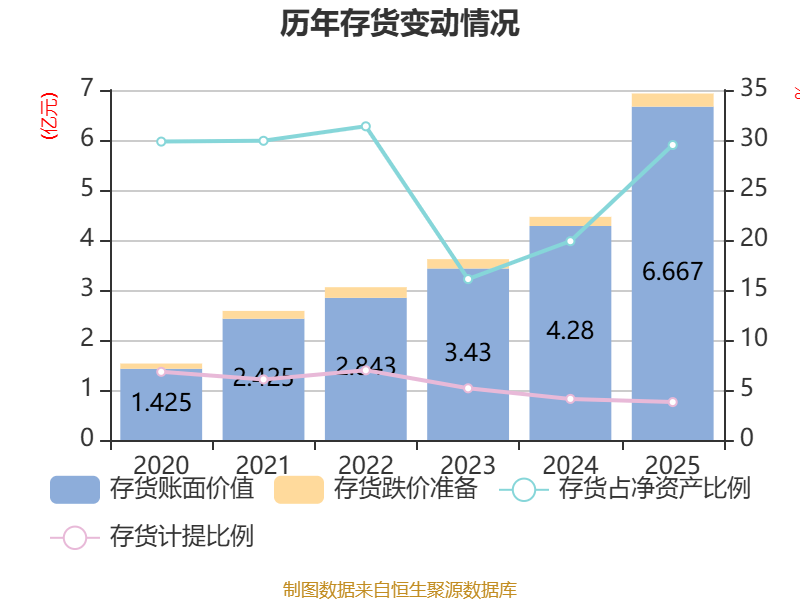 从存货变动来看,截至2025年末,公司存货账面价值为6.67亿元,占净资产的29.5%,较上年末增加2.39亿元。其中,存货跌价准备为2629.68万元,计提比例为3.79%。