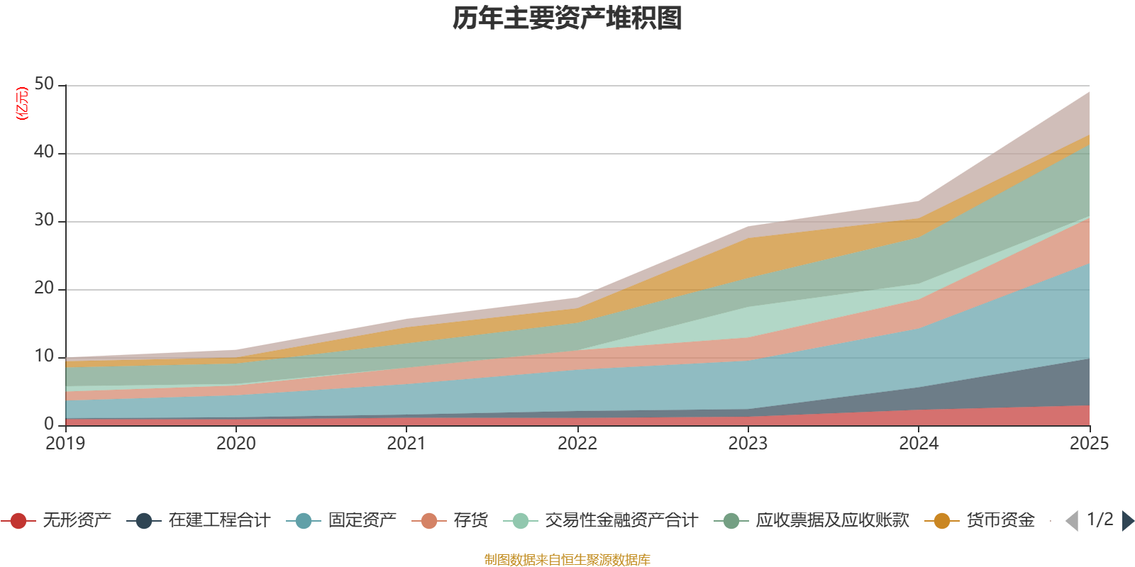资产重大变化方面,截至2025年末,公司交易性金融资产合计较上年末减少86.98%,占公司总资产比重下降6.38个百分点;货币资金较上年末减少47.99%,占公司总资产比重下降5.54个百分点;在建工程合计较上年末增加107.42%,占公司总资产比重上升3.97个百分点;固定资产较上年末增加62.13%,占公司总资产比重上升2.35个百分点。