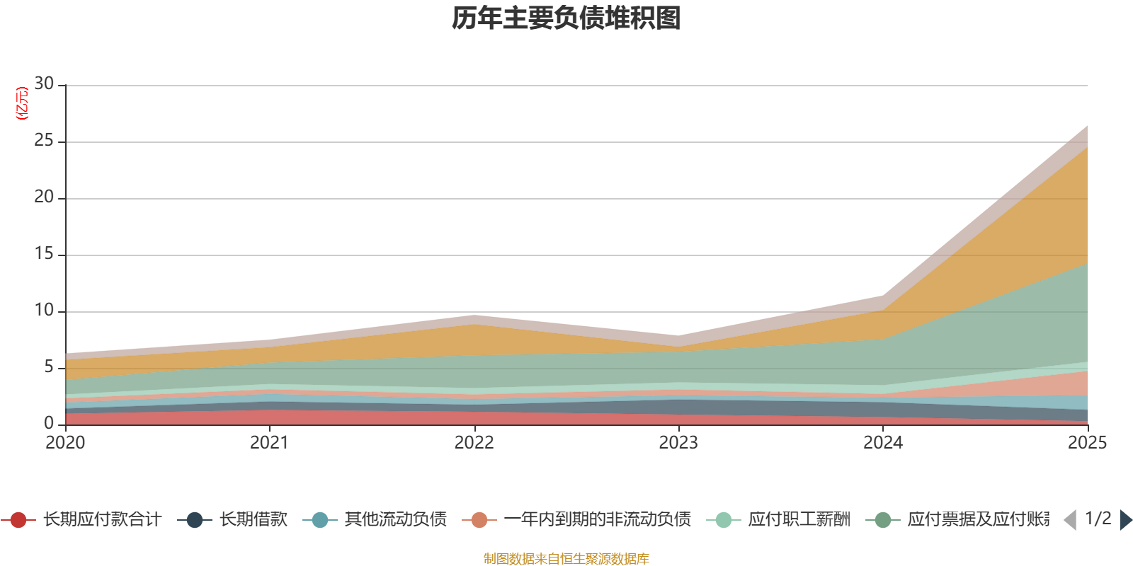 负债重大变化方面,截至2025年末,公司短期借款较上年末增加299.35%,占公司总资产比重上升13.18个百分点;应付票据及应付账款较上年末增加113.82%,占公司总资产比重上升5.4个百分点;一年内到期的非流动负债较上年末增加557.24%,占公司总资产比重上升3.38个百分点;长期借款较上年末减少22.97%,占公司总资产比重下降1.9个百分点。