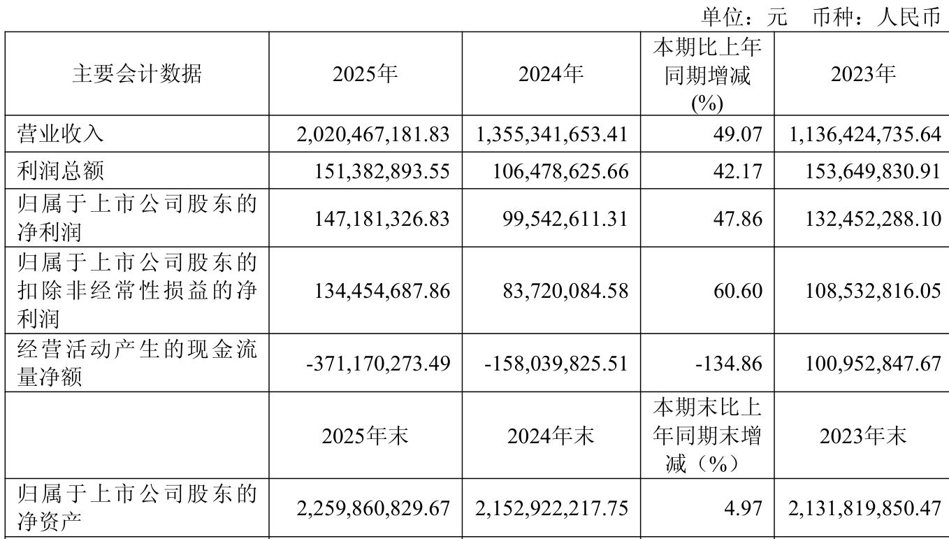 中证智能财讯金帝股份(603270)3月31日披露2025年年度报告。2025年,公司实现营业总收入20.2亿元,同比增长49.07%;归母净利润1.47亿元,同比增长47.86%;扣非净利润1.34亿元,同比增长60.60%;经营活动产生的现金流量净额为-3.71亿元,上年同期为-1.58亿元;报告期内,金帝股份基本每股收益为0.67元,加权平均净资产收益率为6.63%。公司2025年度分配预案为:拟向全体股东每10股派现1.2元(含税)。