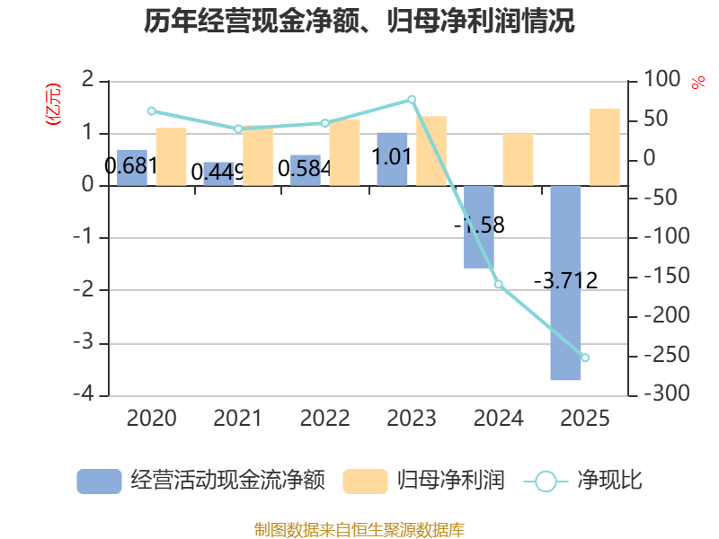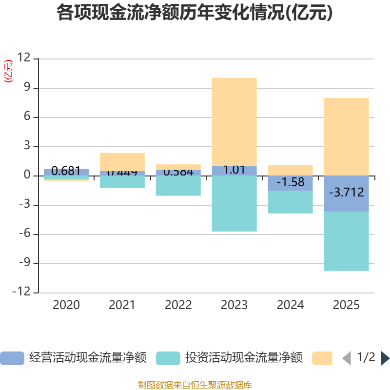 截至2025年,公司经营活动现金流净额为-3.71亿元,同比减少2.13亿元;筹资活动现金流净额7.95亿元,同比增加6.86亿元;投资活动现金流净额-6.08亿元,上年同期为-2.31亿元。