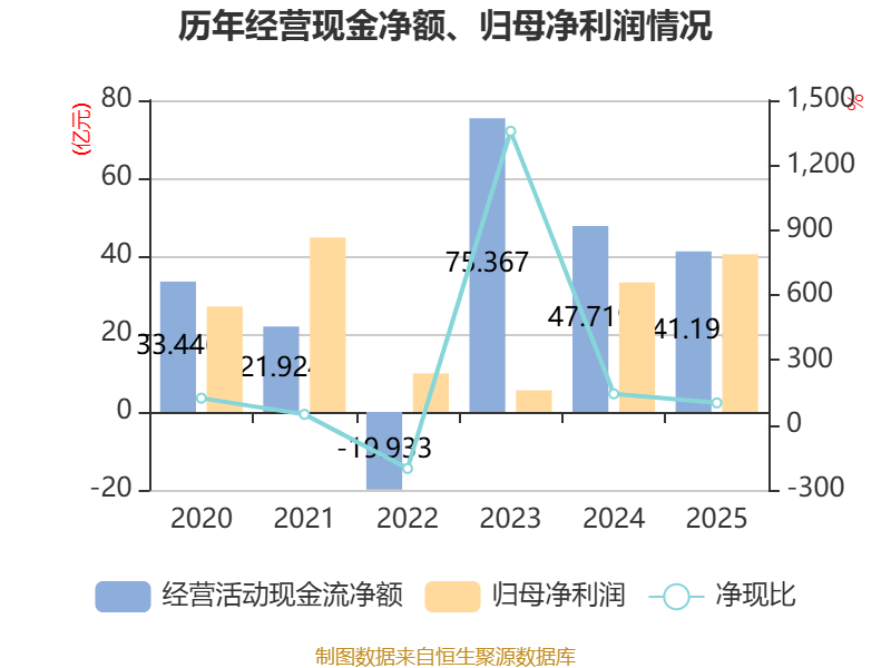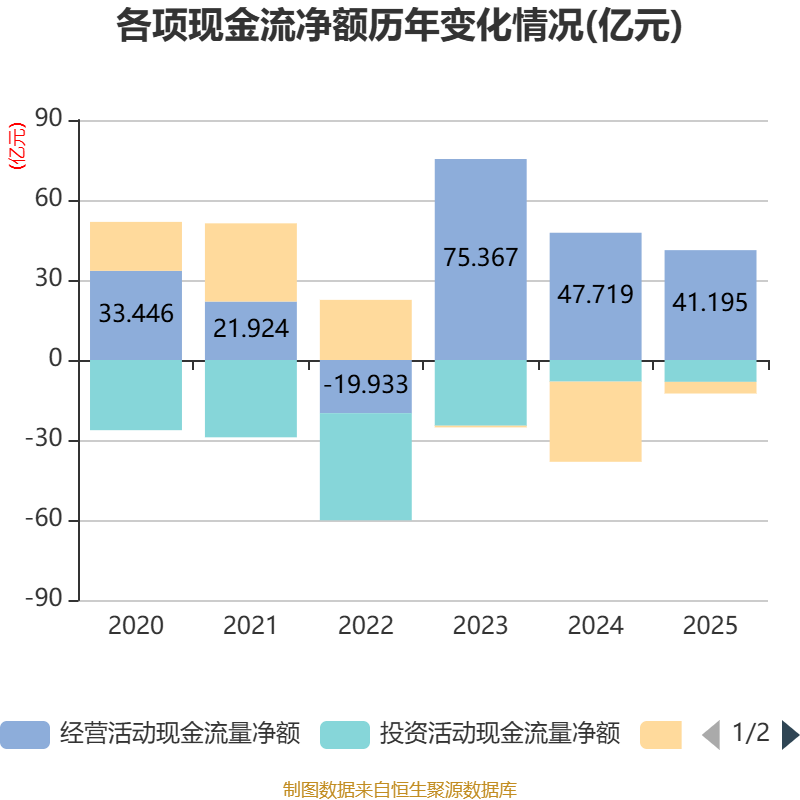 截至2025年,公司经营活动现金流净额为41.2亿元,同比下降13.67%;筹资活动现金流净额-4.37亿元,同比增加25.7亿元;投资活动现金流净额-8.2亿元,上年同期为-8.11亿元。