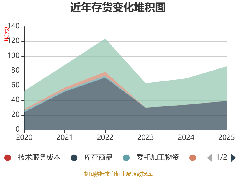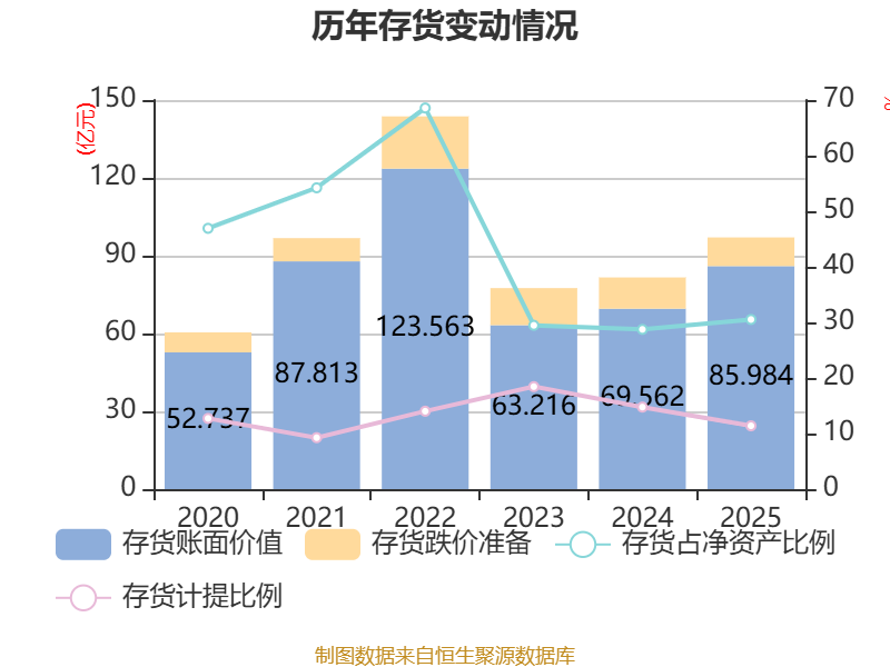 从存货变动来看,截至2025年末,公司存货账面价值为85.98亿元,占净资产的30.52%,较上年末增加16.42亿元。其中,存货跌价准备为11.05亿元,计提比例为11.39%。