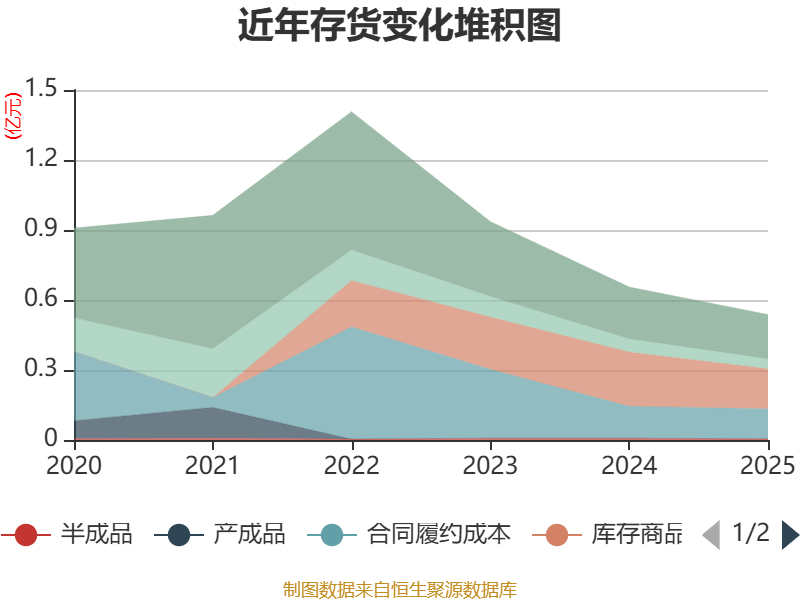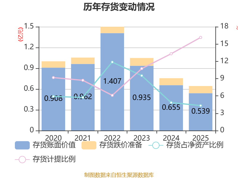 从存货变动来看,截至2025年末,公司存货账面价值为5387.33万元,占净资产的4.32%,较上年末减少1165.92万元。其中,存货跌价准备为1036.81万元,计提比例为16.14%。