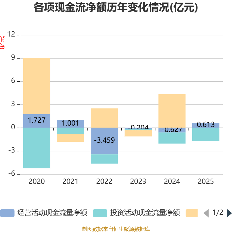 截至2025年,公司经营活动现金流净额为6126.38万元,同比增加1.24亿元;筹资活动现金流净额125.02万元,同比减少4.32亿元;投资活动现金流净额-1.71亿元,上年同期为-1.43亿元。