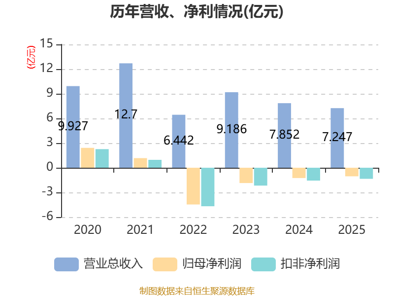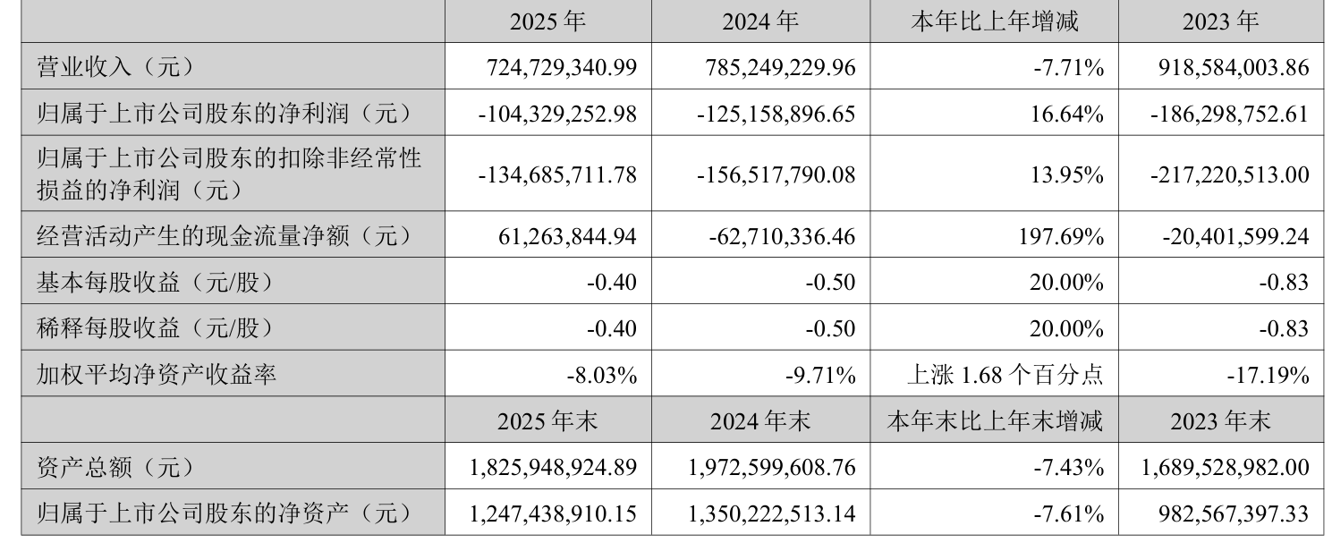 中证智能财讯中孚信息(300659)3月31日披露2025年年度报告。2025年,公司实现营业总收入7.25亿元,同比下降7.71%;归母净利润亏损1.04亿元,上年同期亏损1.25亿元;扣非净利润亏损1.35亿元,上年同期亏损1.57亿元;经营活动产生的现金流量净额为6126.38万元,上年同期为-6271.03万元;报告期内,中孚信息基本每股收益为-0.4元,加权平均净资产收益率为-8.03%。