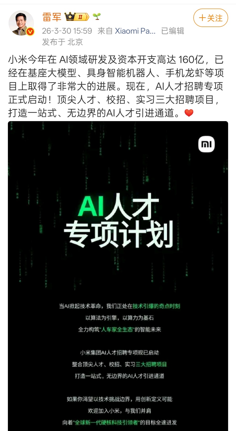 雷军:小米AI人才招聘专项正式启动