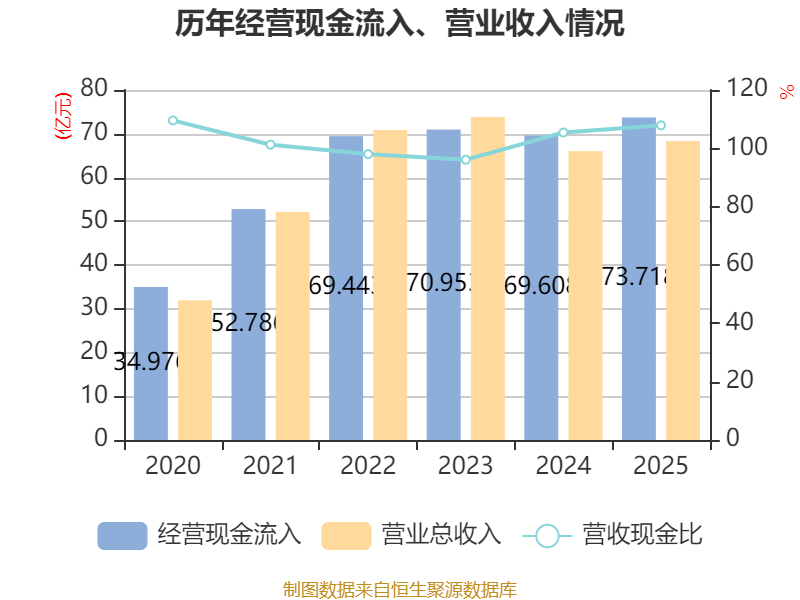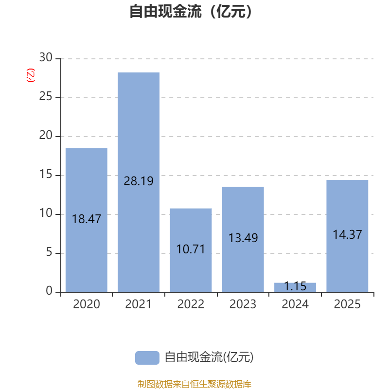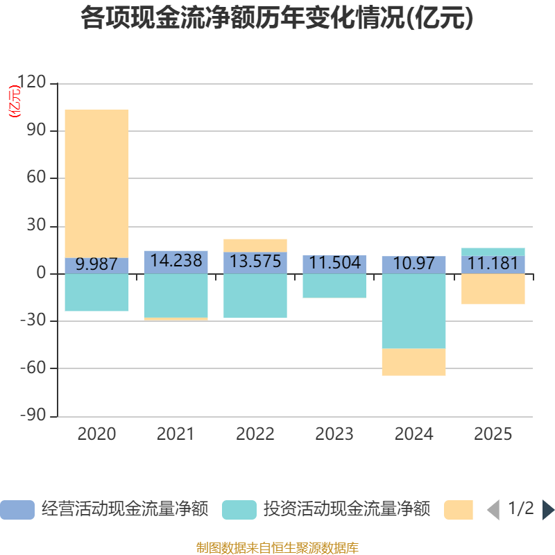 截至2025年,公司经营活动现金流净额为11.18亿元,同比增长1.92%;筹资活动现金流净额-19.27亿元,同比减少2.24亿元;投资活动现金流净额4.92亿元,上年同期为-47.39亿元。
