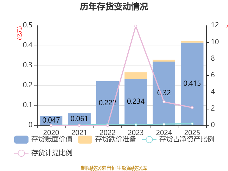 从存货变动来看,截至2025年末,公司存货账面价值为4150.18万元,占净资产的0.2%,较上年末增加954.57万元。其中,存货跌价准备为90.6万元,计提比例为2.14%。