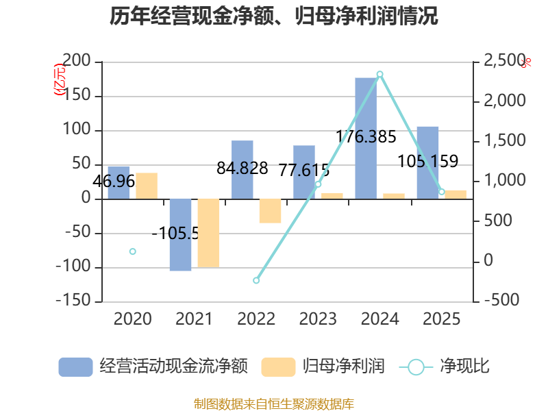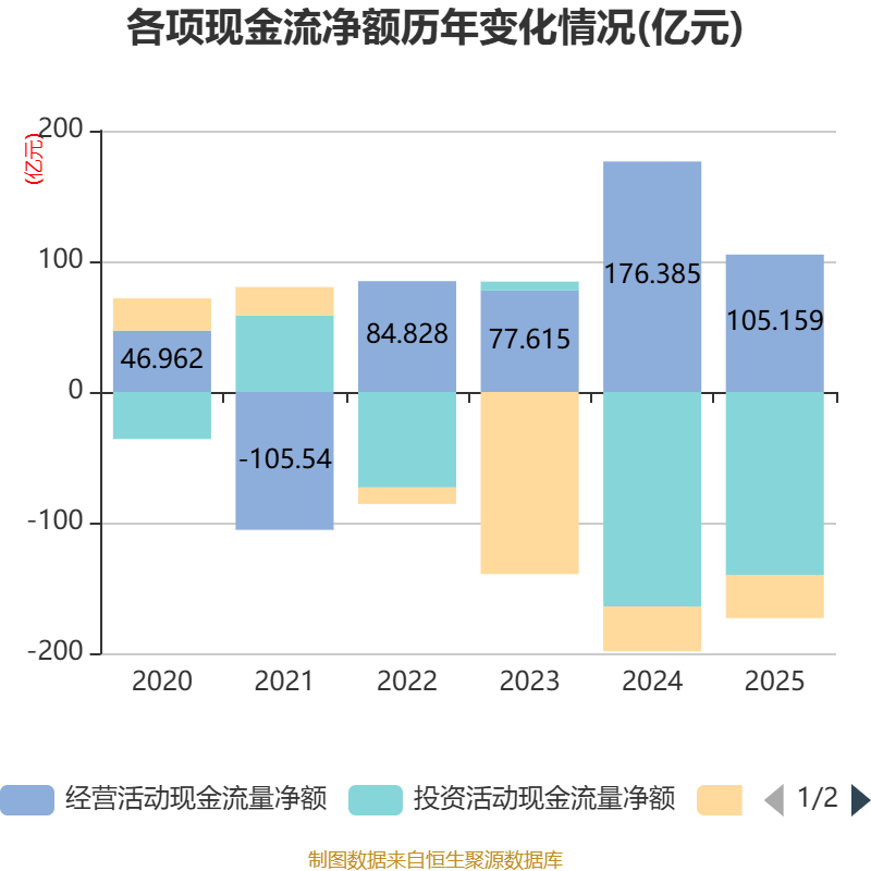截至2025年,公司经营活动现金流净额为105.16亿元,同比下降40.38%;筹资活动现金流净额-33.06亿元,同比增加1.25亿元;投资活动现金流净额-140.03亿元,上年同期为-164.25亿元。