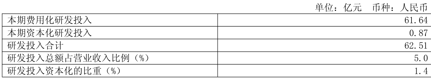 2025年全年,公司研发投入金额为62.51亿元,同比增长9.78%;研发投入占营业收入比例为5%,相比上年同期上升0.1个百分点。此外,公司全年研发投入资本化率为1.4%。