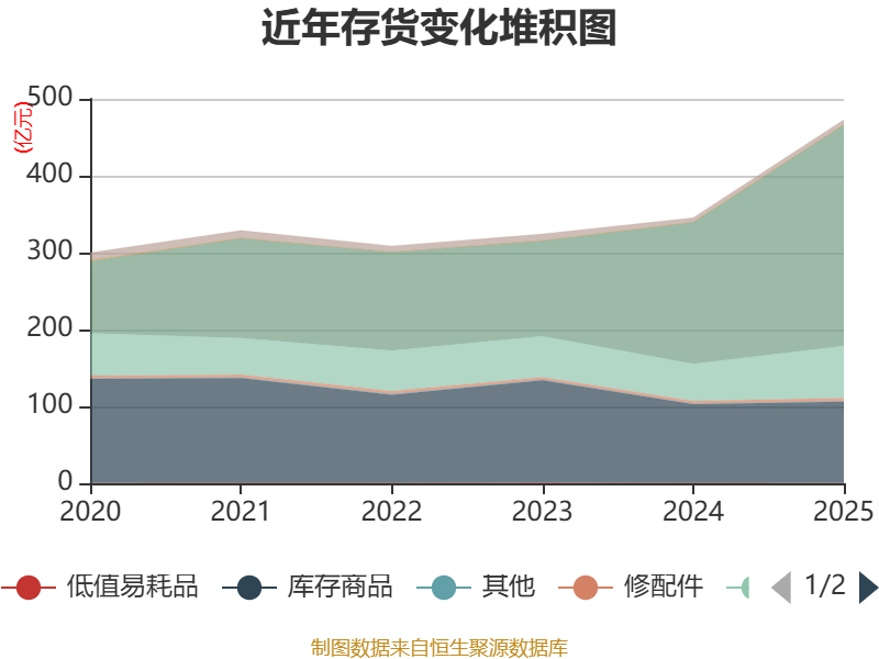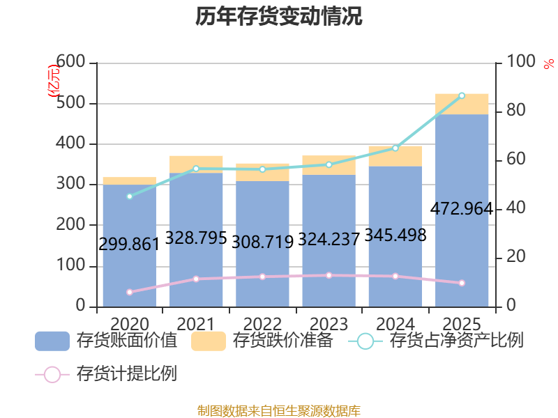 从存货变动来看,截至2025年末,公司存货账面价值为472.96亿元,占净资产的86.47%,较上年末增加127.47亿元。其中,存货跌价准备为50.52亿元,计提比例为9.65%。