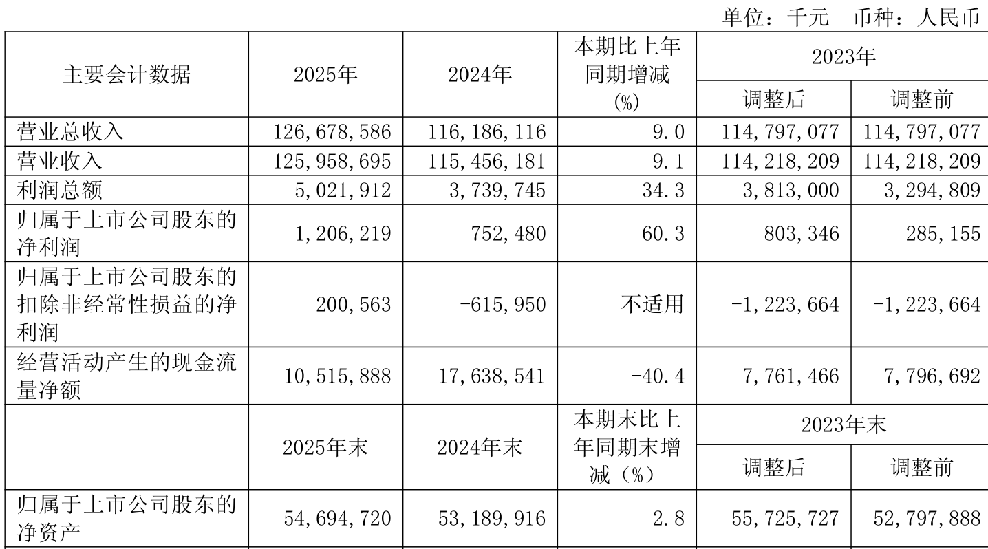 中证智能财讯上海电气(601727)3月31日披露2025年年度报告。2025年,公司实现营业总收入1266.79亿元,同比增长9.03%;归母净利润12.06亿元,同比增长60.30%;扣非净利润2.01亿元,同比扭亏;经营活动产生的现金流量净额为105.16亿元,同比下降40.38%;报告期内,上海电气基本每股收益为0.078元,加权平均净资产收益率为2.24%。公司2025年度分配预案为:拟向全体股东每10股派现0.1425元(含税)。
