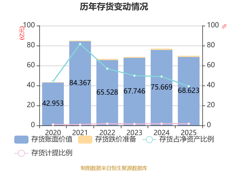 从存货变动来看,截至2025年末,公司存货账面价值为68.62亿元,占净资产的39.28%,较上年末减少7.05亿元。其中,存货跌价准备为1.17亿元,计提比例为1.67%。
