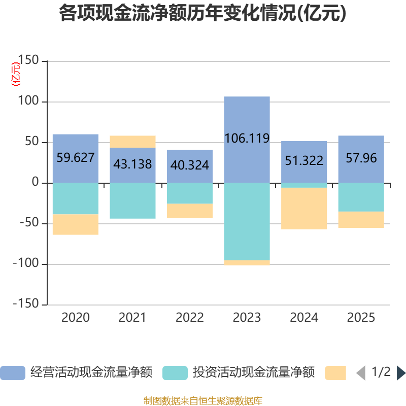 截至2025年,公司经营活动现金流净额为57.96亿元,同比增长12.94%;筹资活动现金流净额-20.15亿元,同比增加31.06亿元;投资活动现金流净额-35.54亿元,上年同期为-6.19亿元。
