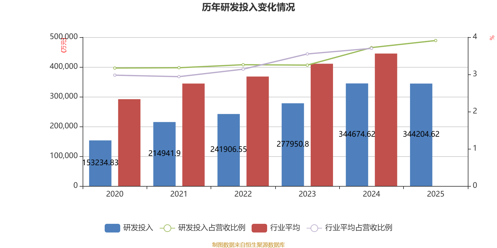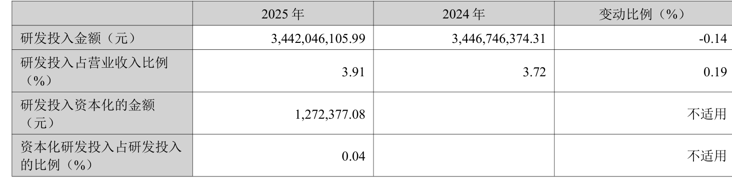 2025年全年,公司研发投入金额为34.42亿元,同比下降0.14%;研发投入占营业收入比例为3.91%,相比上年同期上升0.19个百分点。此外,公司全年研发投入资本化率为0.04%。