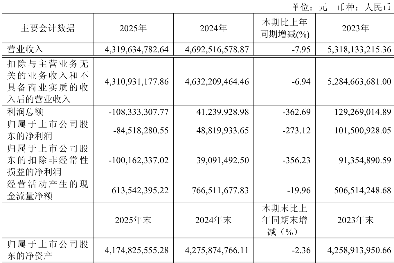 中证智能财讯英利汽车(601279)3月31日披露2025年年度报告。2025年,公司实现营业总收入43.2亿元,同比下降7.95%;归母净利润亏损8451.83万元,上年同期盈利4881.99万元;扣非净利润亏损1亿元,上年同期盈利3909.15万元;经营活动产生的现金流量净额为6.14亿元,同比下降19.96%;报告期内,英利汽车基本每股收益为-0.053元,加权平均净资产收益率为-2.00%。