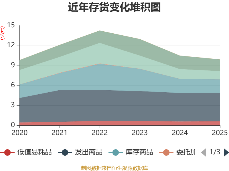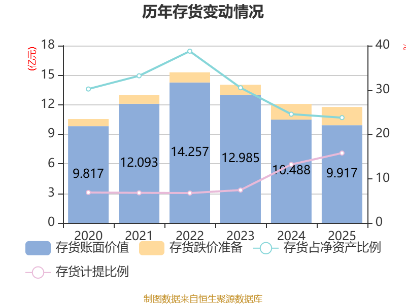 从存货变动来看,截至2025年末,公司存货账面价值为9.92亿元,占净资产的23.75%,较上年末减少5706.88万元。其中,存货跌价准备为1.86亿元,计提比例为15.76%。