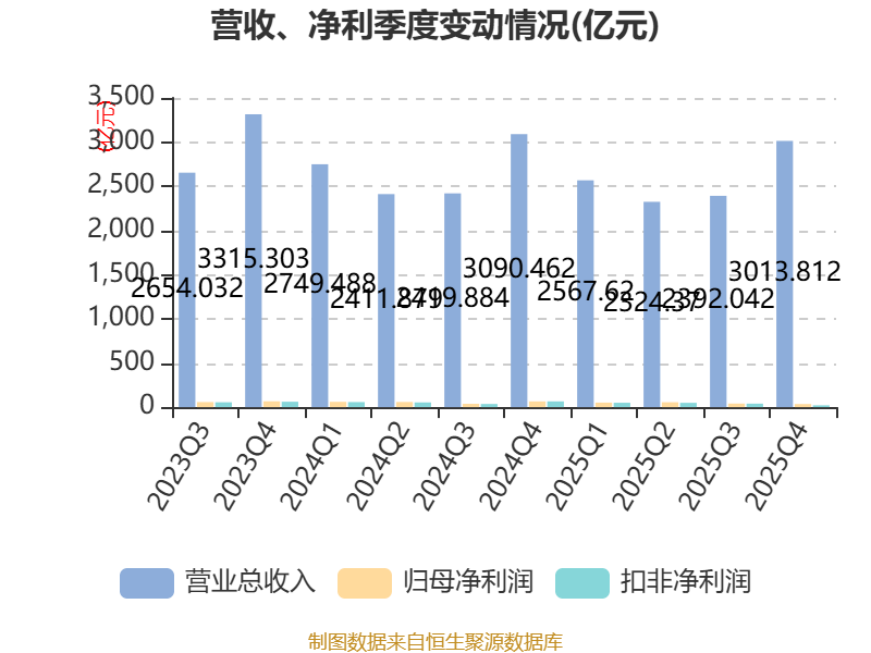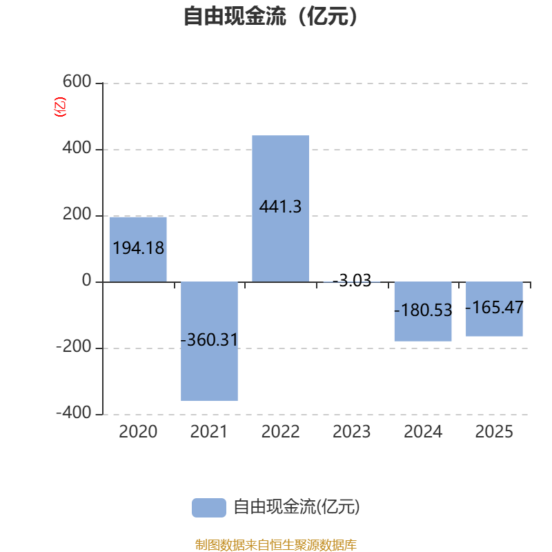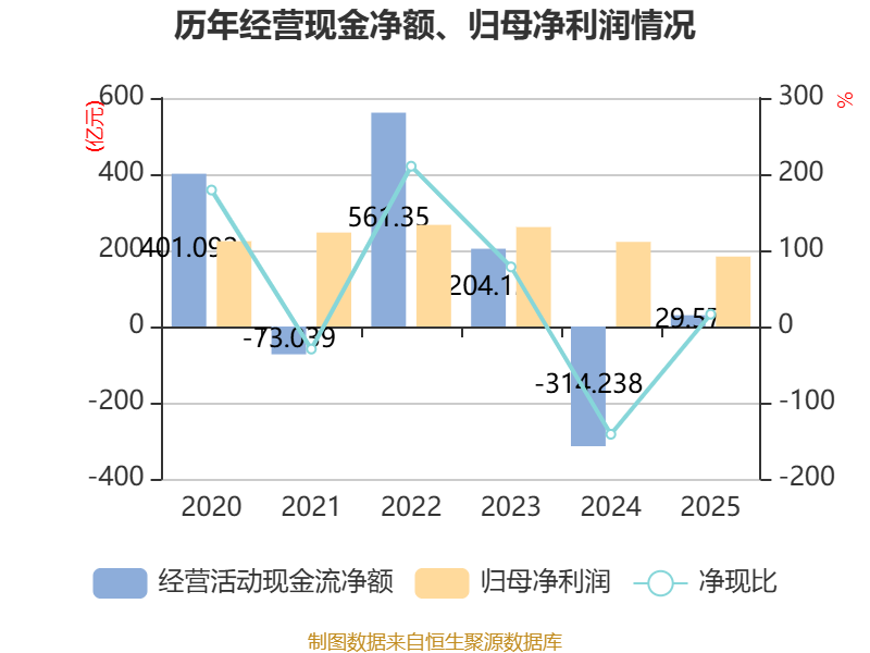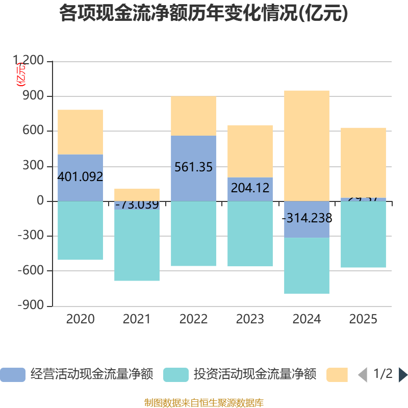 截至2025年,公司经营活动现金流净额为29.57亿元,同比增加343.81亿元;筹资活动现金流净额598.3亿元,同比减少349.28亿元;投资活动现金流净额-569.61亿元,上年同期为-480.4亿元。
