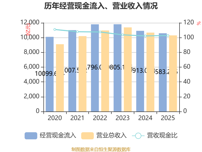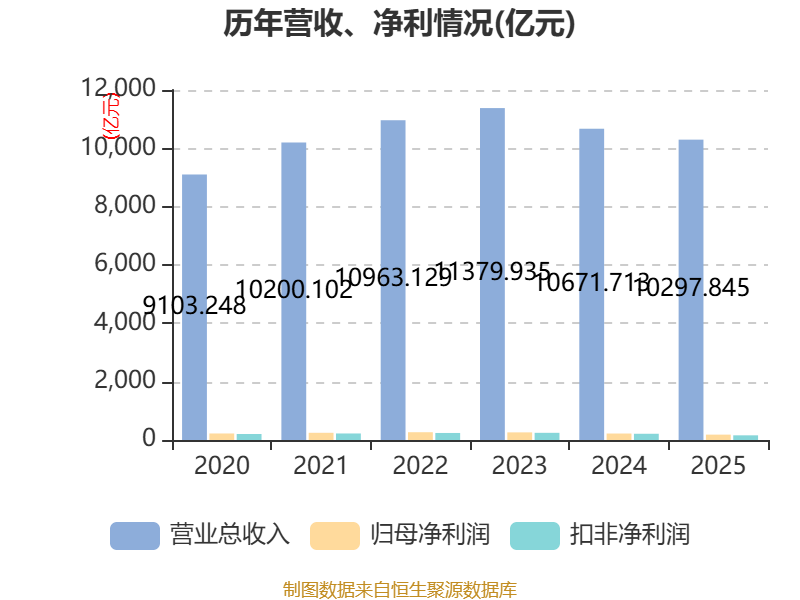 中证智能财讯中国铁建(601186)3月31日披露2025年年度报告。2025年,公司实现营业总收入10297.84亿元,同比下降3.50%;归母净利润183.63亿元,同比下降17.34%;扣非净利润159.98亿元,同比下降24.98%;经营活动产生的现金流量净额为29.57亿元,上年同期为-314.24亿元;报告期内,中国铁建基本每股收益为1.18元,加权平均净资产收益率为5.91%。公司2025年度分配预案为:拟向全体股东每10股派现3元(含税)。