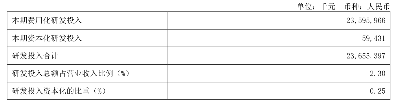 2025年全年,公司研发投入金额为236.55亿元,同比下降8.08%;研发投入占营业收入比例为2.3%,相比上年同期下降0.11个百分点。此外,公司全年研发投入资本化率为0.25%。