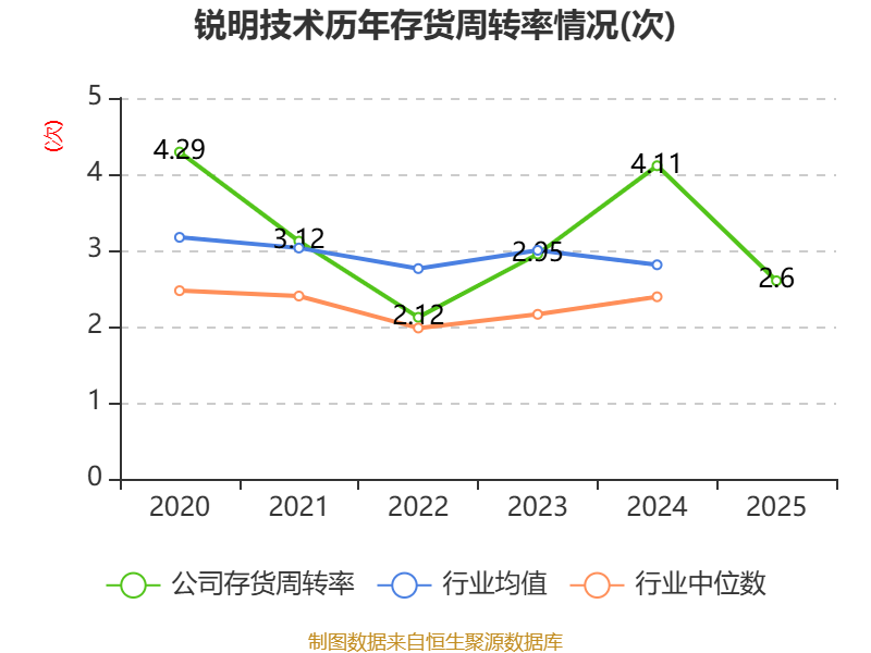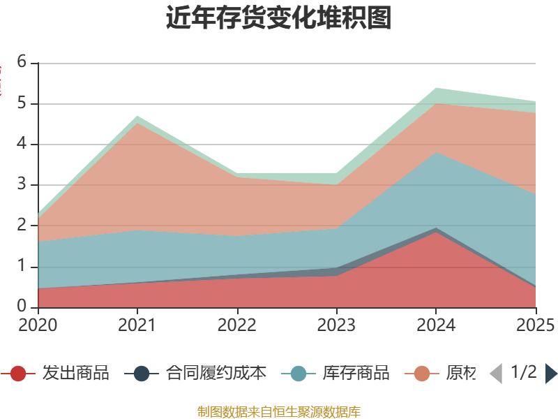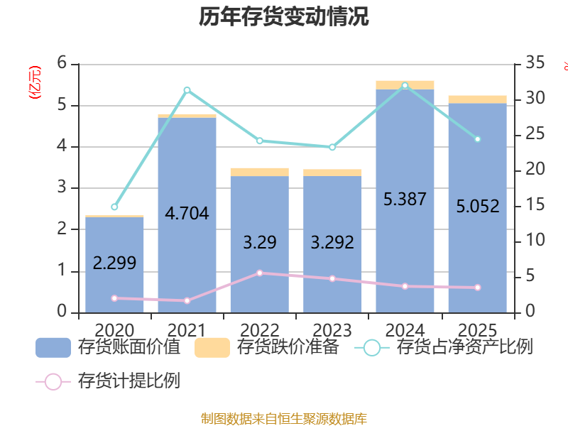 从存货变动来看,截至2025年末,公司存货账面价值为5.05亿元,占净资产的24.4%,较上年末减少3346.11万元。其中,存货跌价准备为1840.11万元,计提比例为3.51%。