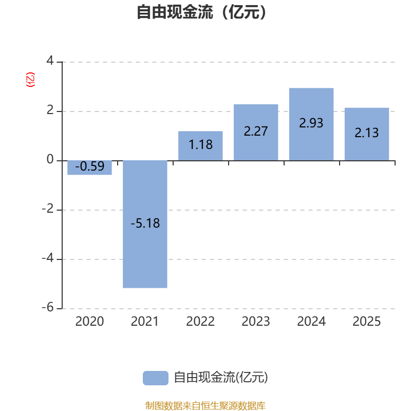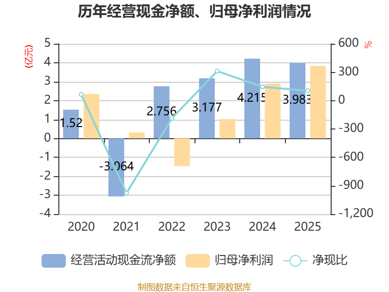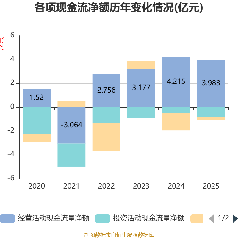 截至2025年,公司经营活动现金流净额为3.98亿元,同比下降5.5%;筹资活动现金流净额-2269.4万元,同比增加1.23亿元;投资活动现金流净额-8475.14万元,上年同期为-4984.93万元。