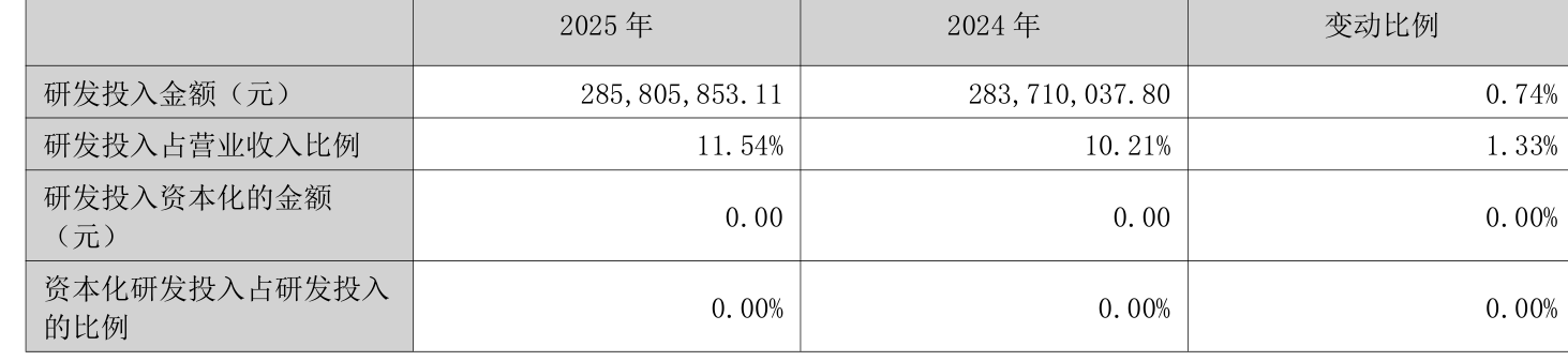 2025年全年,公司研发投入金额为2.86亿元,同比增长0.74%;研发投入占营业收入比例为11.54%,相比上年同期上升1.33个百分点。此外,公司全年研发投入资本化率为0%。