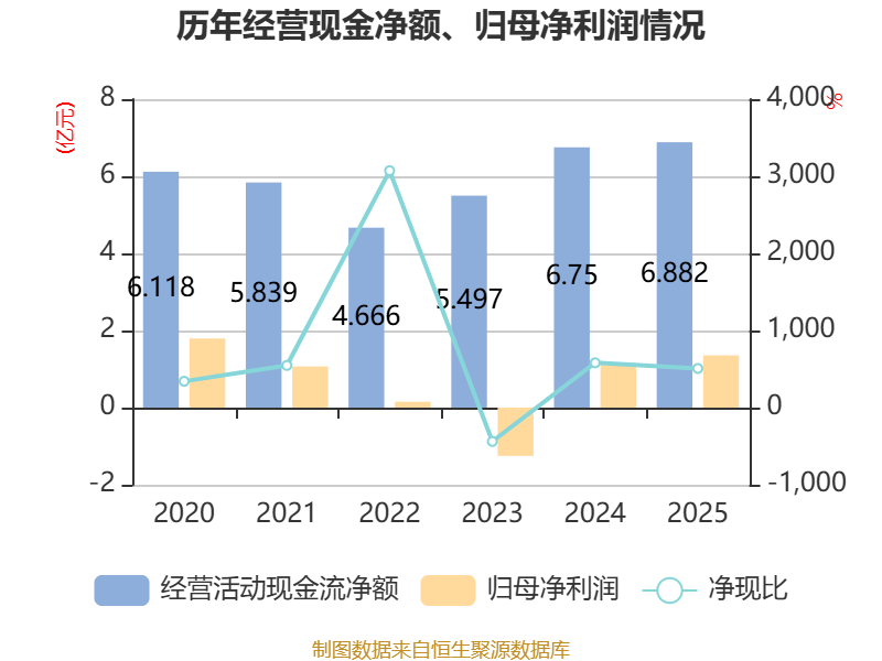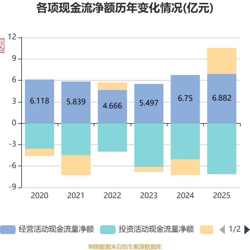 截至2025年,公司经营活动现金流净额为6.88亿元,同比增长1.96%;筹资活动现金流净额3.65亿元,同比增加5.86亿元;投资活动现金流净额-7.13亿元,上年同期为-5.06亿元。