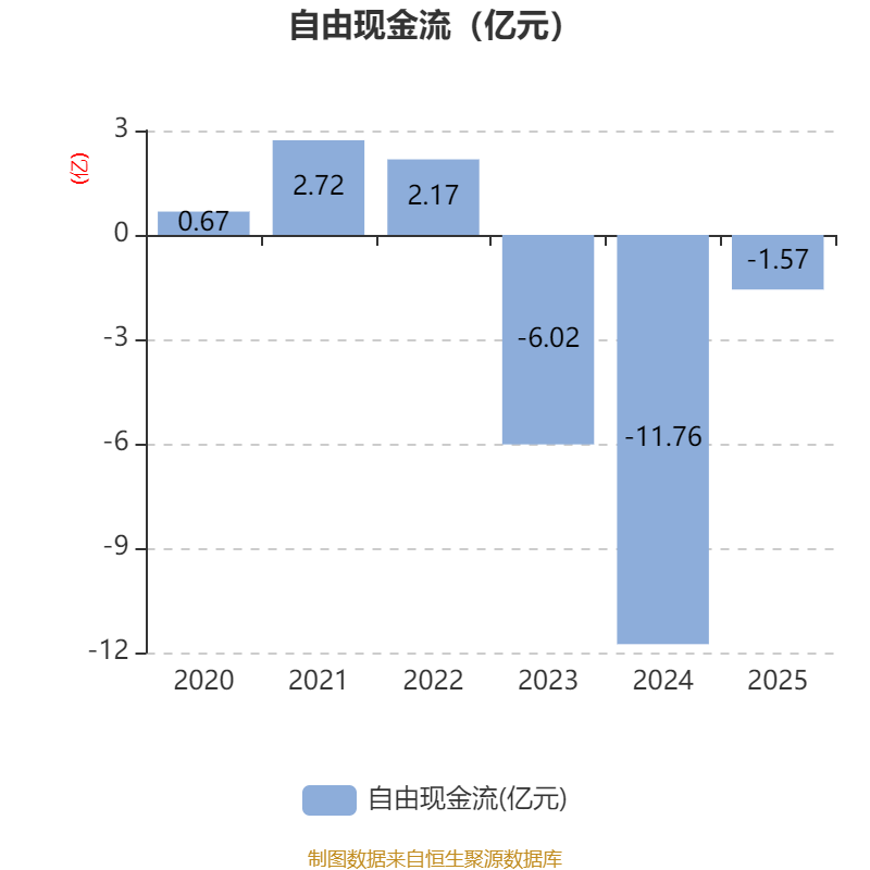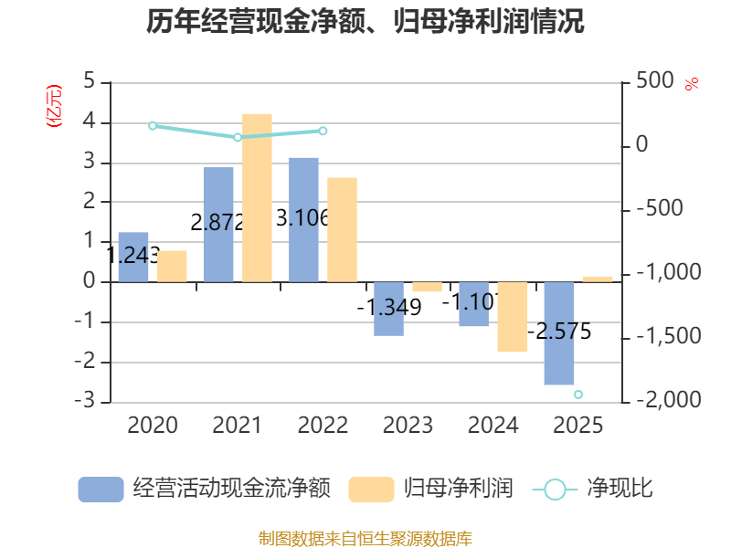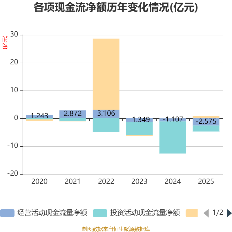 截至2025年,公司经营活动现金流净额为-2.57亿元,同比减少1.47亿元;筹资活动现金流净额8243.61万元,同比增加7686.35万元;投资活动现金流净额-2.16亿元,上年同期为-11.54亿元。