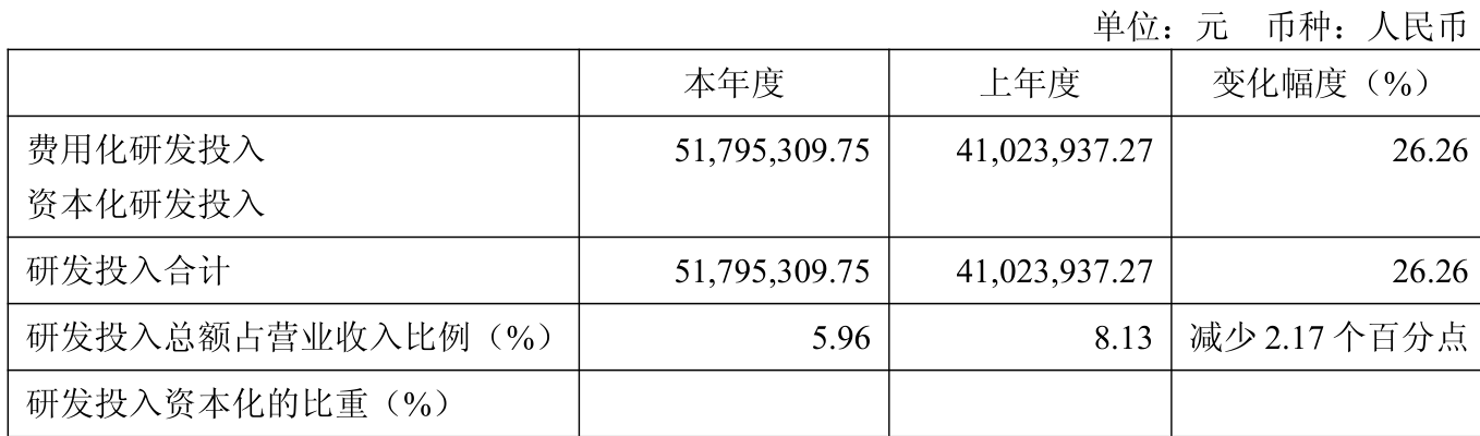 2025年全年,公司研发投入金额为5179.53万元,同比增长26.26%;研发投入占营业收入比例为5.96%,相比上年同期下降2.17个百分点。