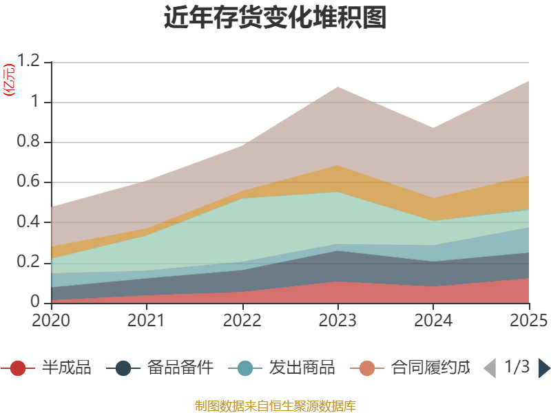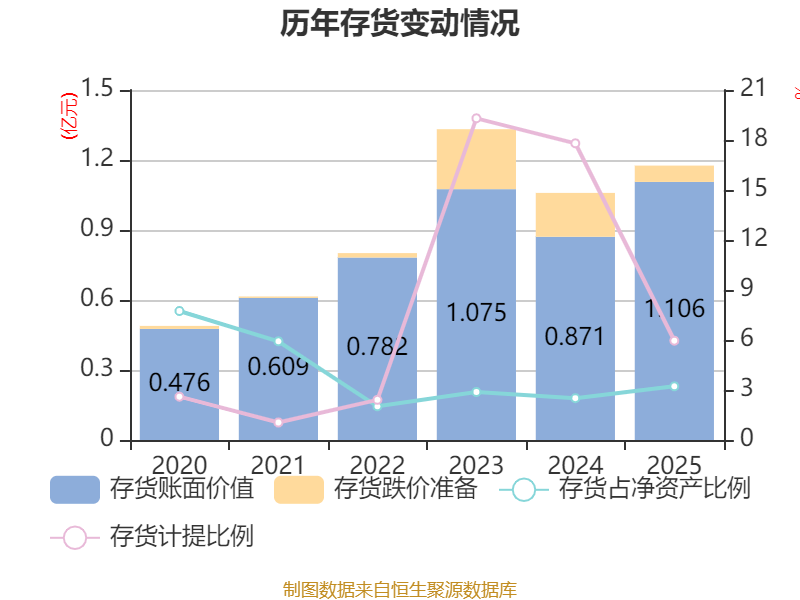 从存货变动来看,截至2025年末,公司存货账面价值为1.11亿元,占净资产的3.22%,较上年末增加2349.5万元。其中,存货跌价准备为701.31万元,计提比例为5.96%。