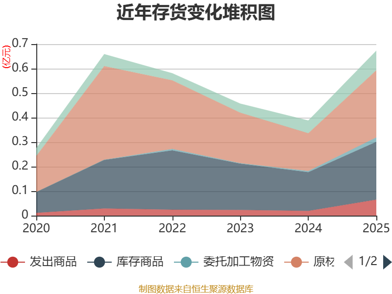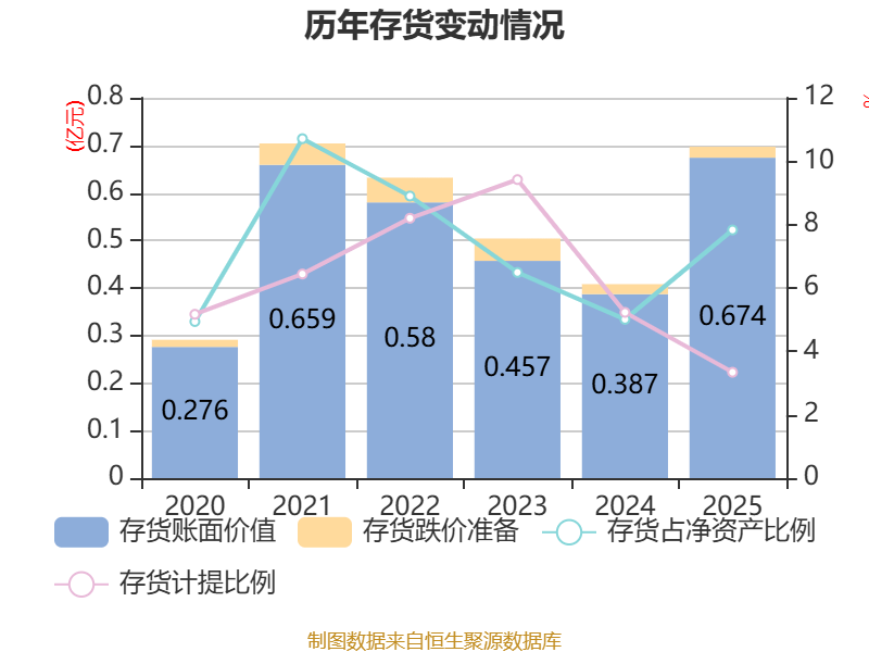从存货变动来看,截至2025年末,公司存货账面价值为6738.36万元,占净资产的7.83%,较上年末增加2864.2万元。其中,存货跌价准备为232.49万元,计提比例为3.34%。