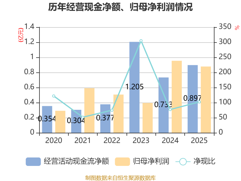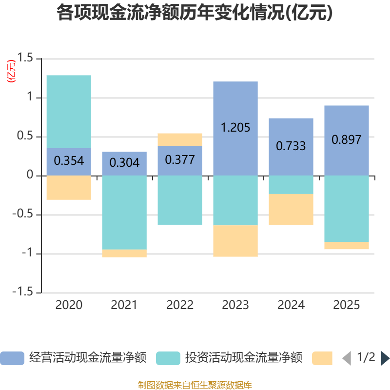 截至2025年,公司经营活动现金流净额为8973.54万元,同比增长22.39%;筹资活动现金流净额-938.93万元,同比增加3009.53万元;投资活动现金流净额-8505.62万元,上年同期为-2367.03万元。