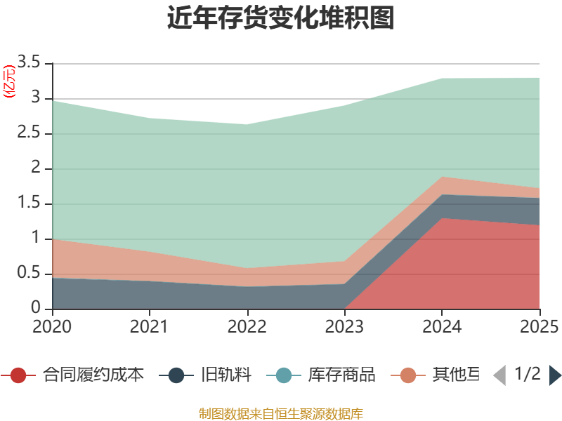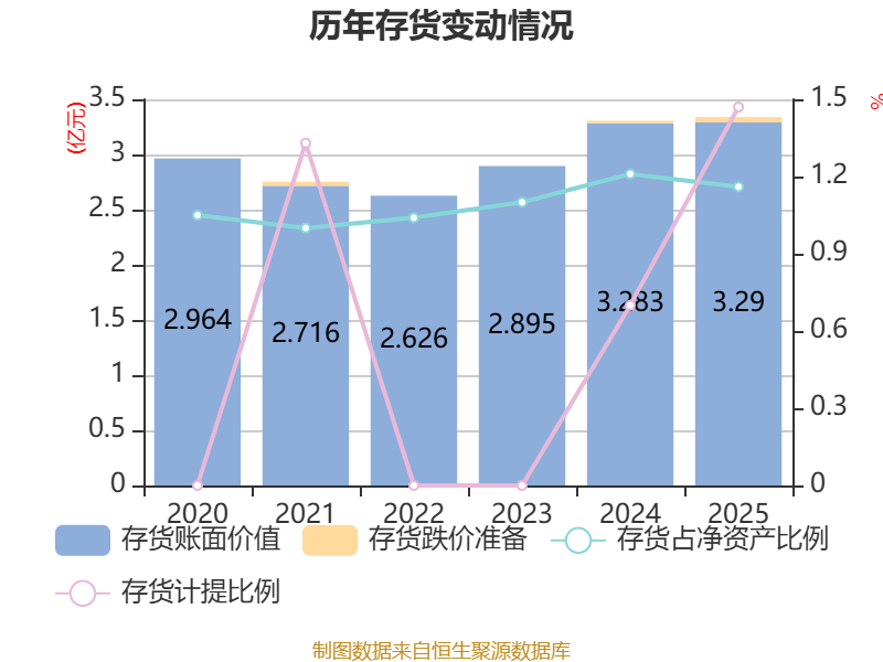 从存货变动来看,截至2025年末,公司存货账面价值为3.29亿元,占净资产的1.16%,较上年末增加68.96万元。其中,存货跌价准备为491.16万元,计提比例为1.47%。