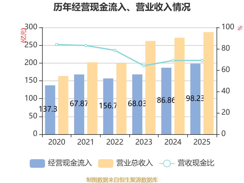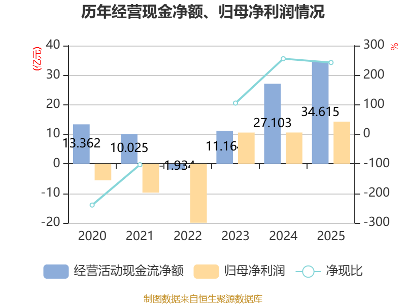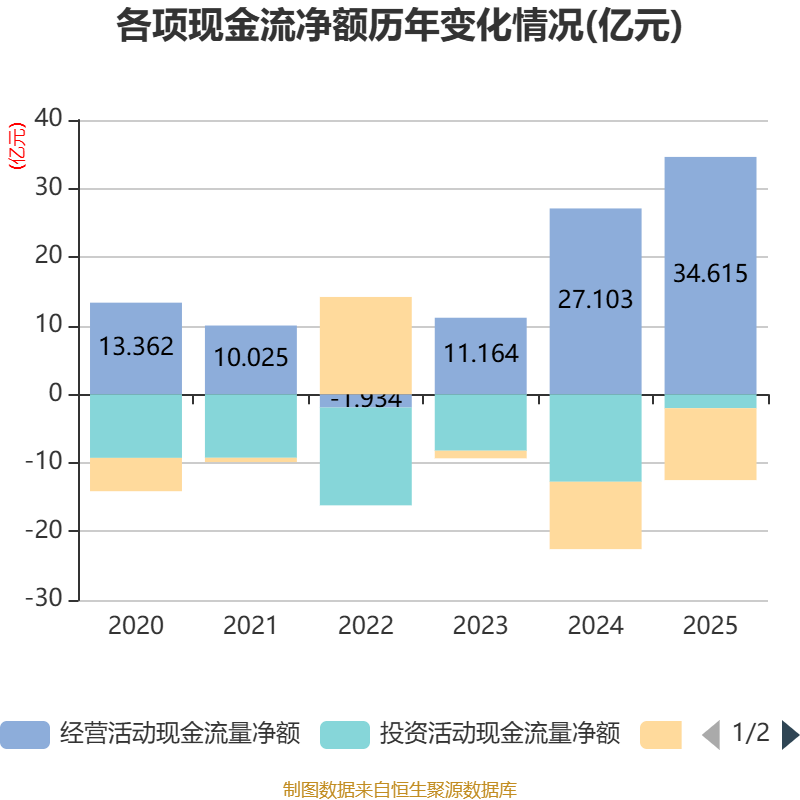 截至2025年,公司经营活动现金流净额为34.62亿元,同比增长27.72%;筹资活动现金流净额-10.49亿元,同比减少6649.98万元;投资活动现金流净额-2.03亿元,上年同期为-12.76亿元。