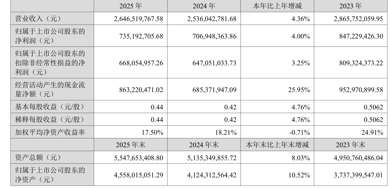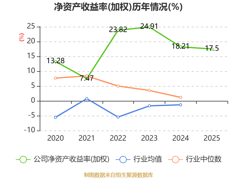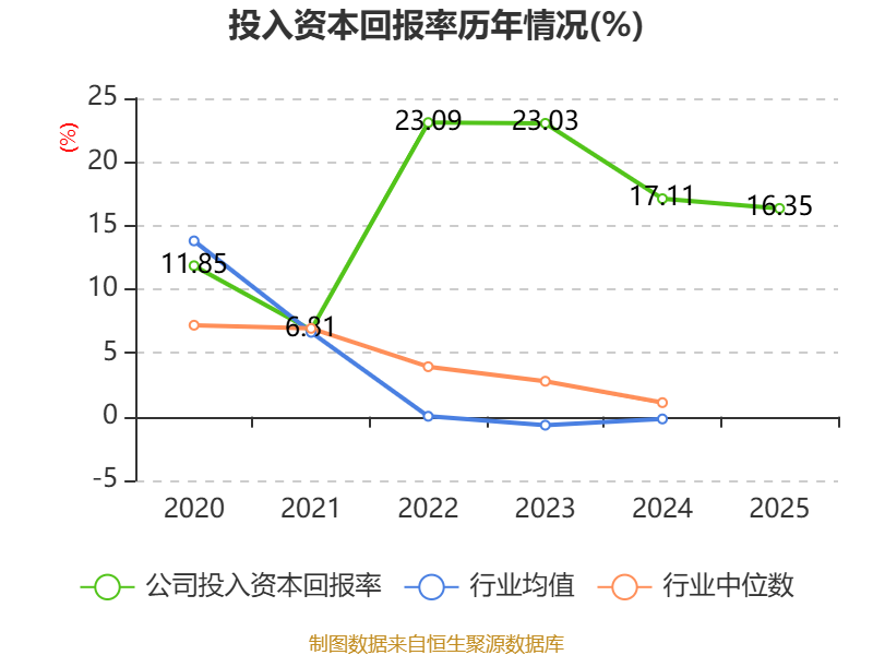 数据显示,2025年公司加权平均净资产收益率为17.5%,较上年同期下降0.71个百分点。公司2025年投入资本回报率为16.35%,较上年同期下降0.76个百分点。