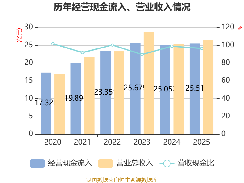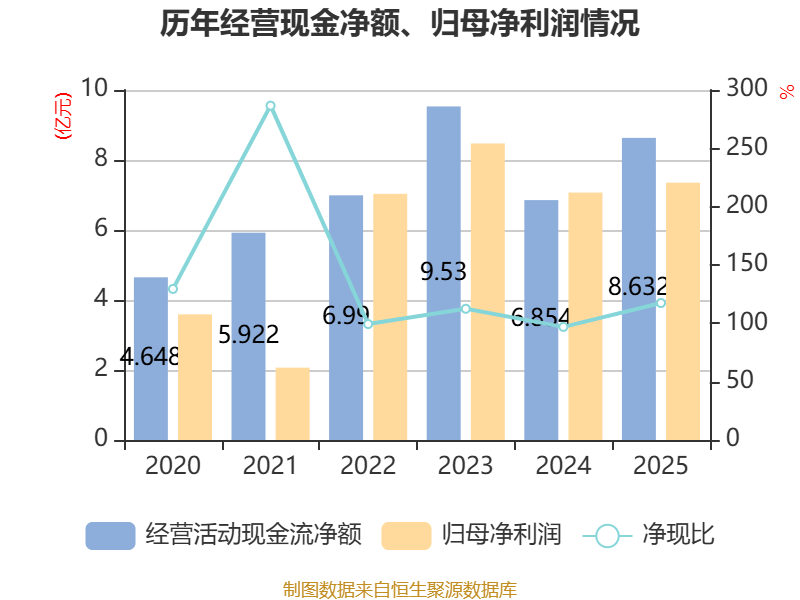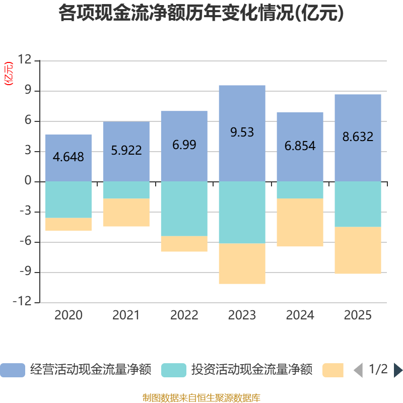 截至2025年,公司经营活动现金流净额为8.63亿元,同比增长25.95%;筹资活动现金流净额-4.64亿元,同比增加1165.11万元;投资活动现金流净额-4.53亿元,上年同期为-1.7亿元。