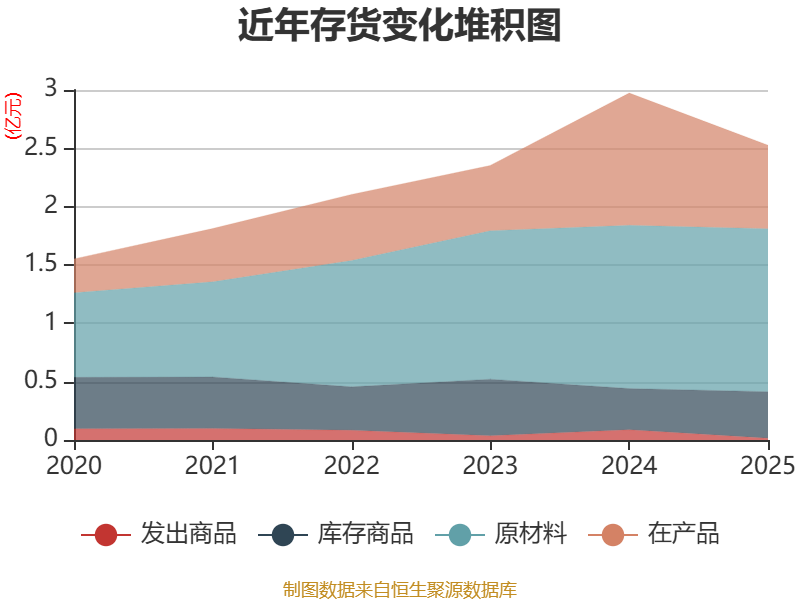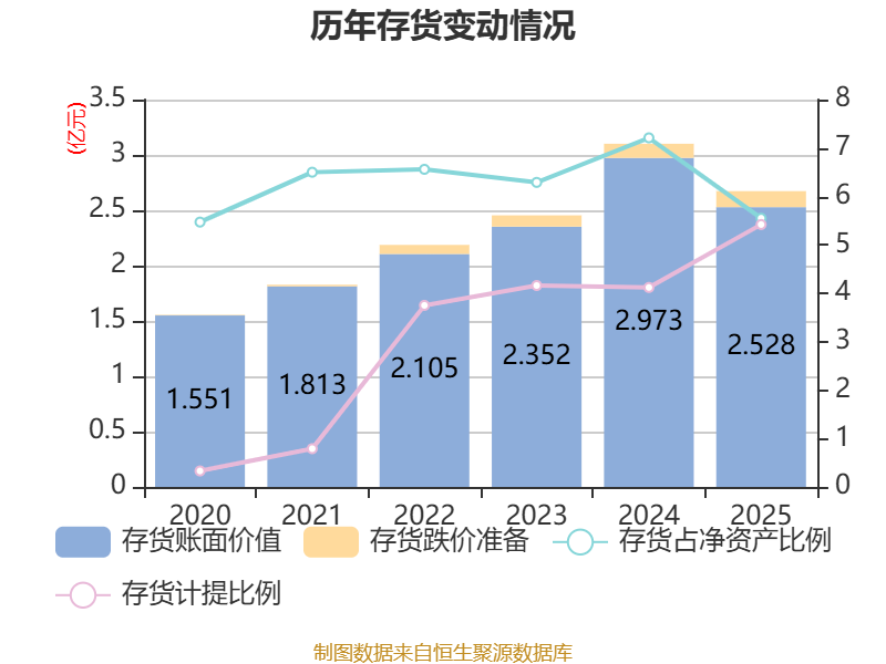 从存货变动来看,截至2025年末,公司存货账面价值为2.53亿元,占净资产的5.55%,较上年末减少4454.17万元。其中,存货跌价准备为1448.87万元,计提比例为5.42%。