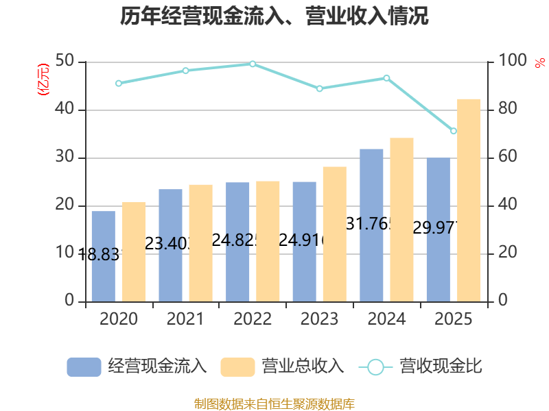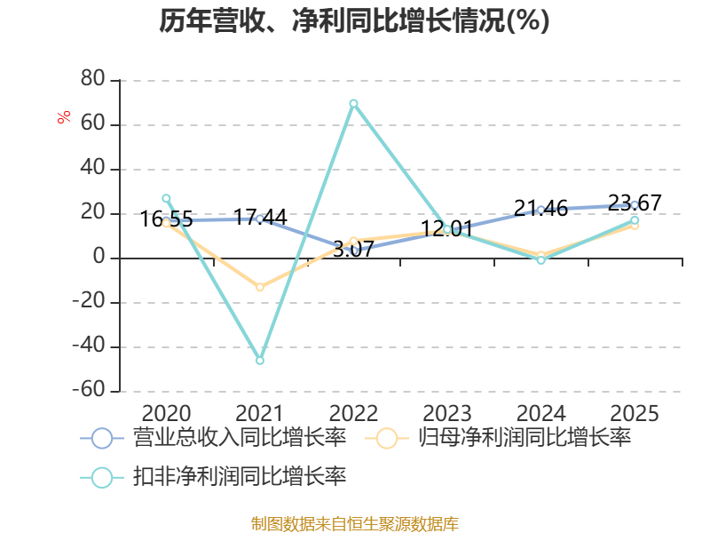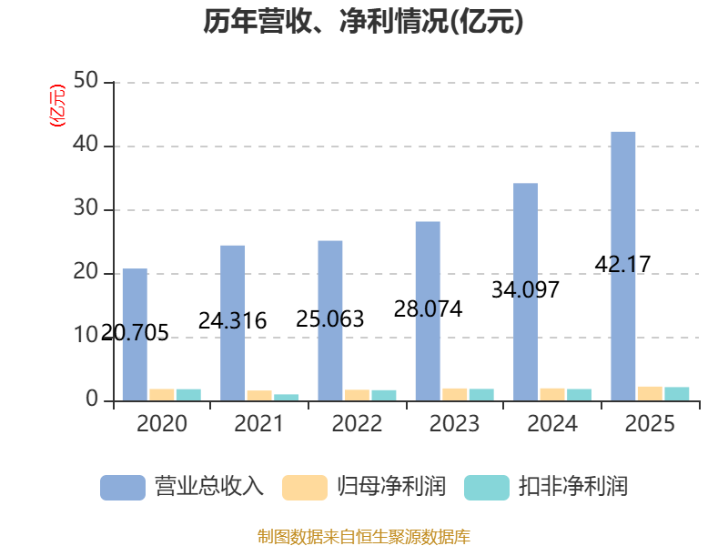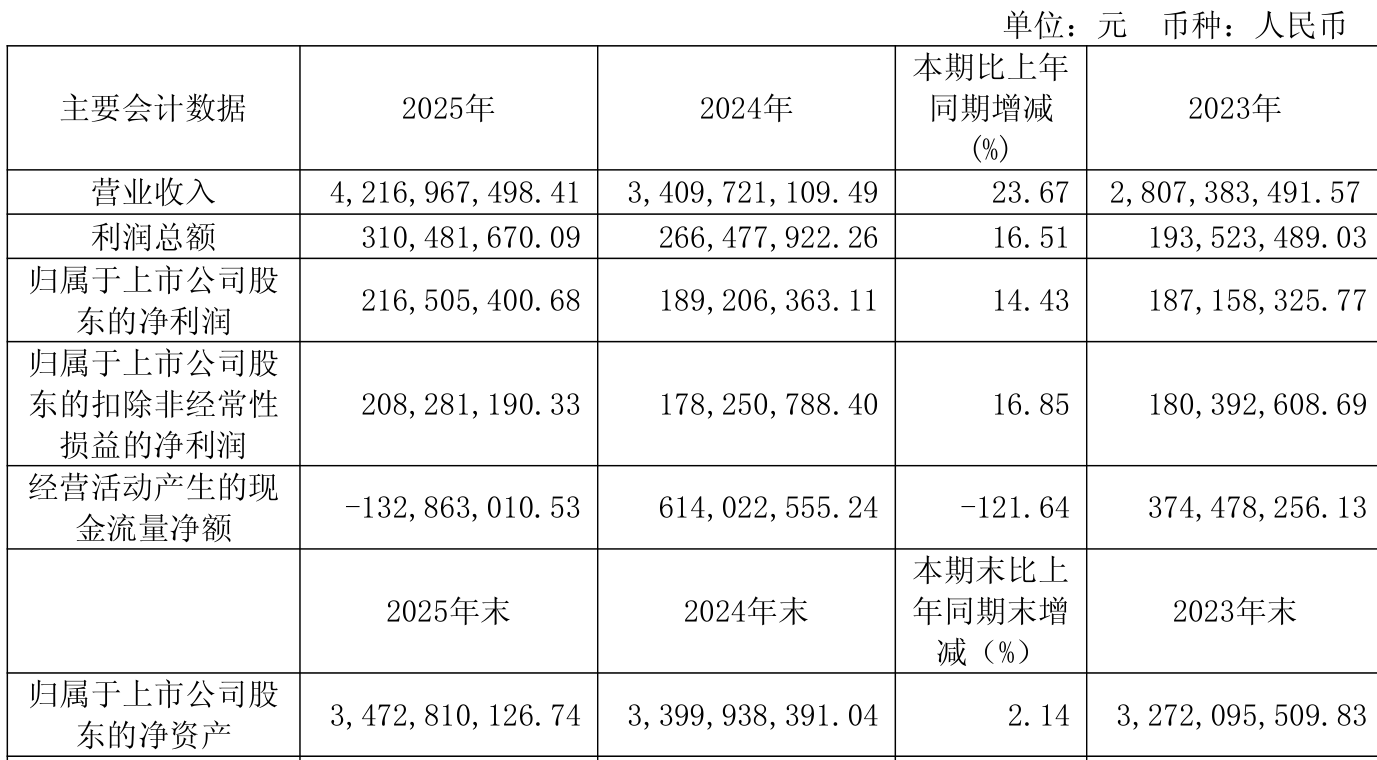 中证智能财讯航天工程(603698)3月31日披露2025年年度报告。2025年,公司实现营业总收入42.17亿元,同比增长23.67%;归母净利润2.17亿元,同比增长14.43%;扣非净利润2.08亿元,同比增长16.85%;经营活动产生的现金流量净额为-1.33亿元,上年同期为6.14亿元;报告期内,航天工程基本每股收益为0.4元,加权平均净资产收益率为6.24%。公司2025年度分配预案为:拟向全体股东每10股派现0.75元(含税)。