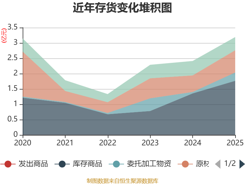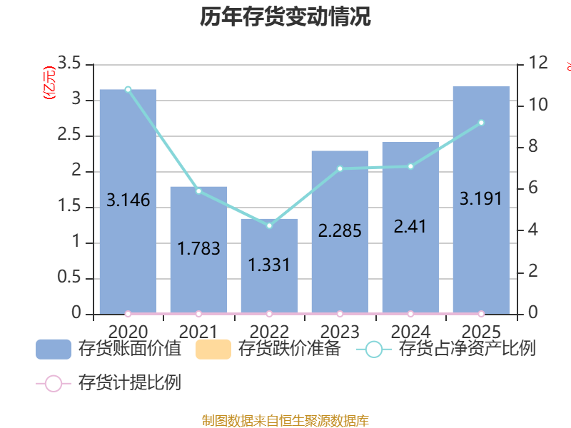 从存货变动来看,截至2025年末,公司存货账面价值为3.19亿元,占净资产的9.19%,较上年末增加7816.35万元。公司本期没有计提存货跌价准备。