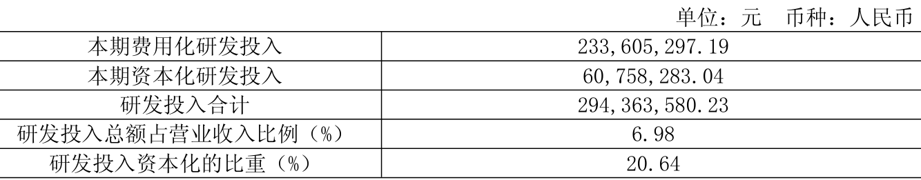 2025年全年,公司研发投入金额为2.94亿元,同比增长19.31%;研发投入占营业收入比例为6.98%,相比上年同期下降0.26个百分点。此外,公司全年研发投入资本化率为20.64%。