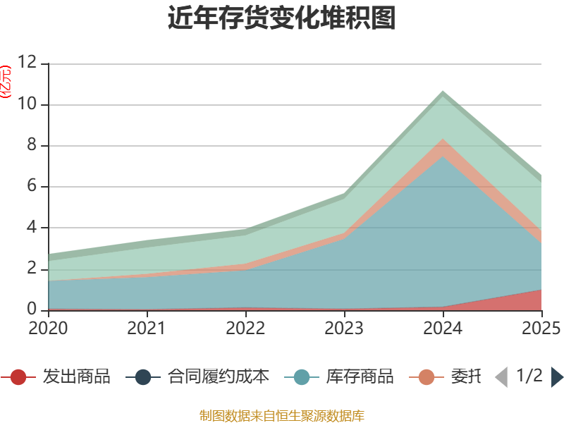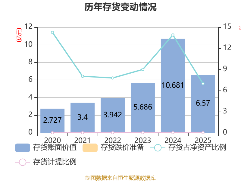 从存货变动来看,截至2025年末,公司存货账面价值为6.57亿元,占净资产的6.97%,较上年末减少4.11亿元。公司本期没有计提存货跌价准备。