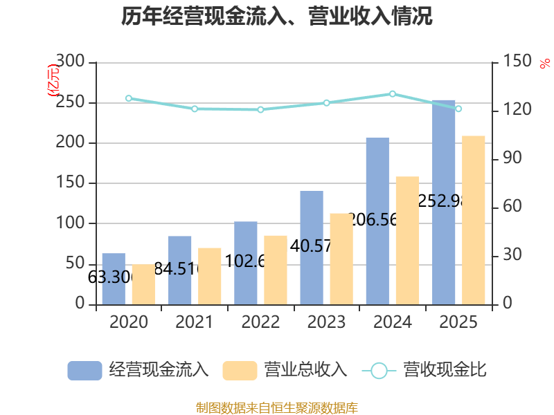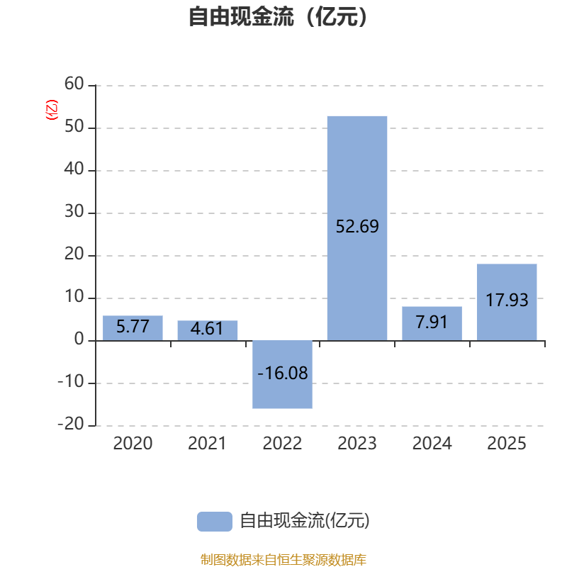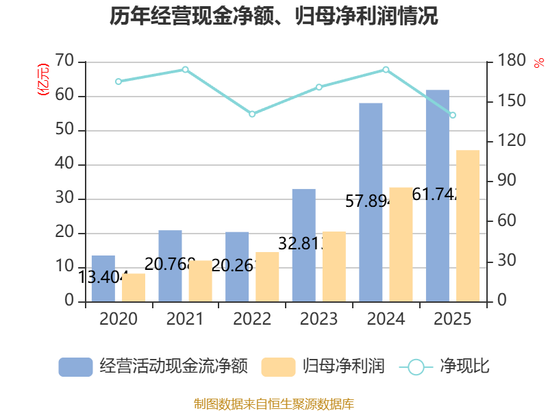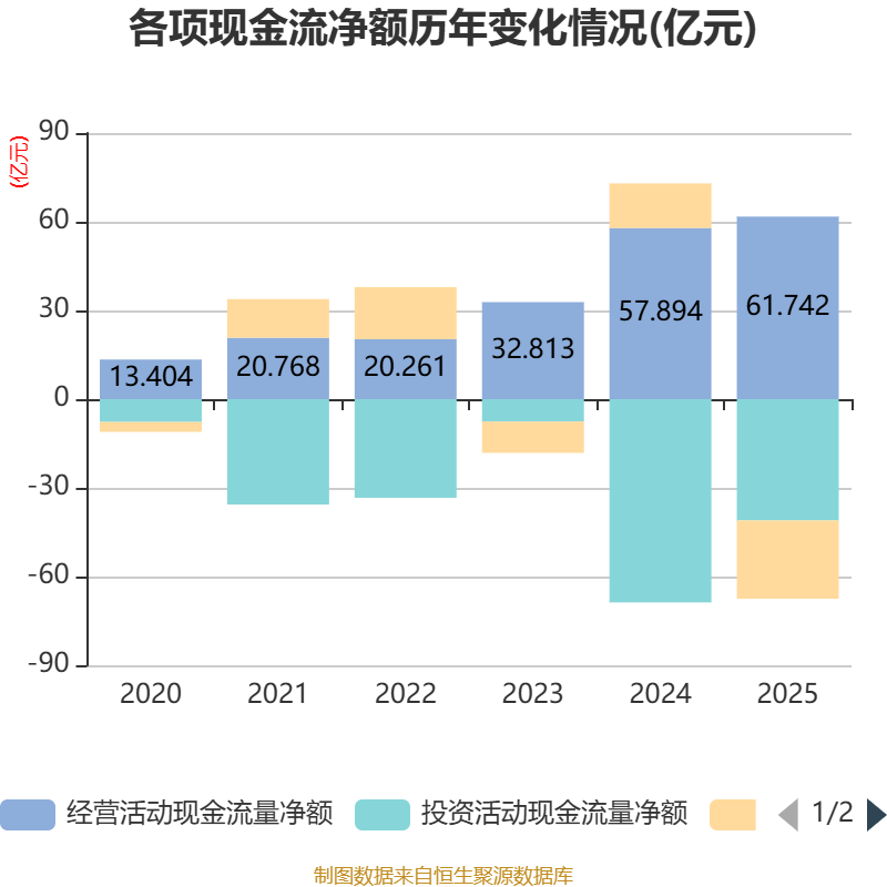 截至2025年,公司经营活动现金流净额为61.74亿元,同比增长6.65%;筹资活动现金流净额-26.48亿元,同比减少41.55亿元;投资活动现金流净额-41.02亿元,上年同期为-68.75亿元。