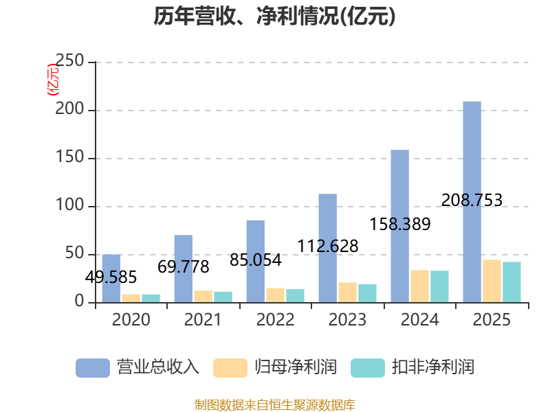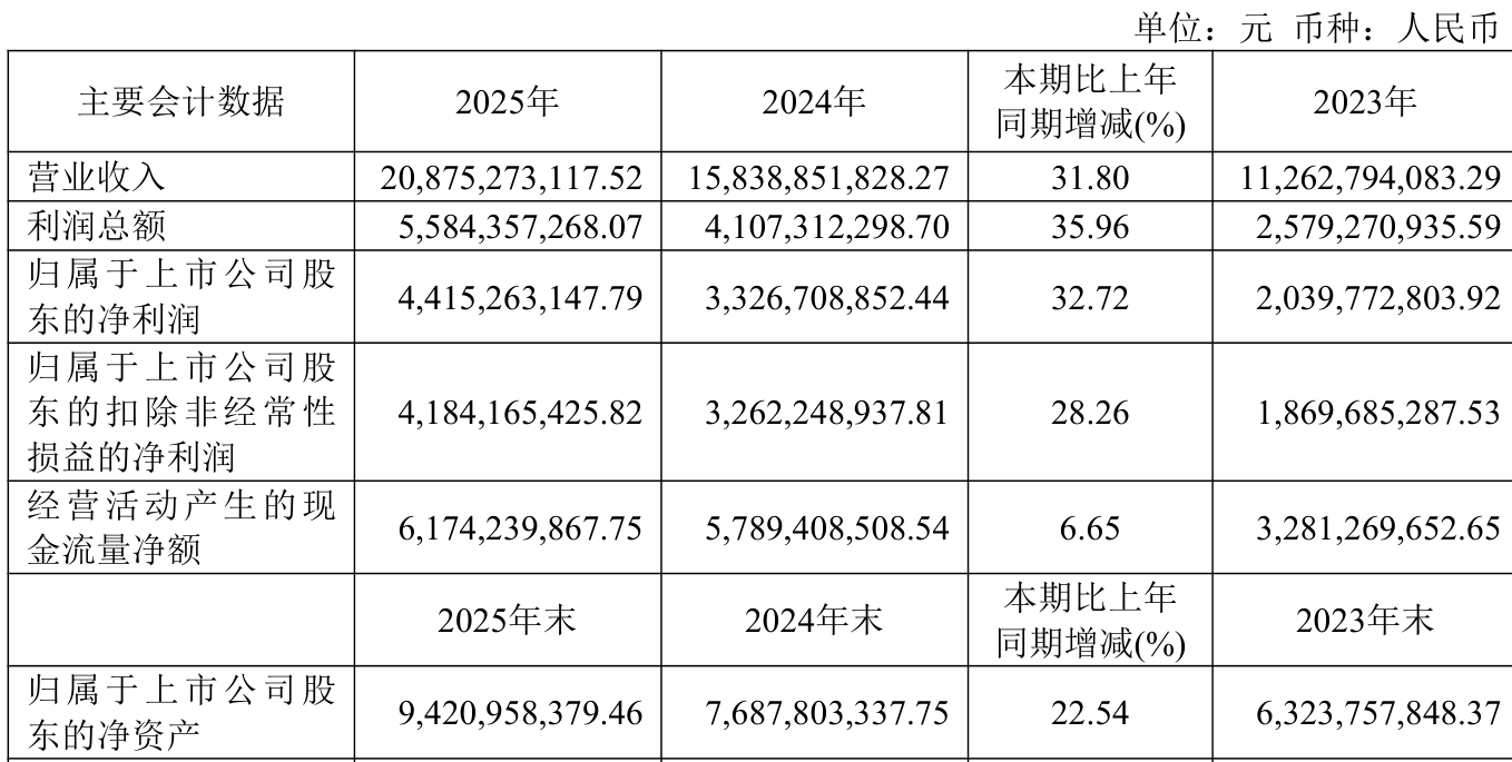 中证智能财讯东鹏饮料(605499)3月31日披露2025年年度报告。2025年,公司实现营业总收入208.75亿元,同比增长31.80%;归母净利润44.15亿元,同比增长32.72%;扣非净利润41.84亿元,同比增长28.26%;经营活动产生的现金流量净额为61.74亿元,同比增长6.65%;报告期内,东鹏饮料基本每股收益为8.4907元,加权平均净资产收益率为51.61%。公司2025年度分配预案为:拟向全体股东每10股转3股,派现25元(含税)。