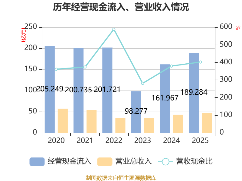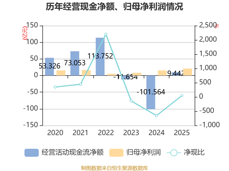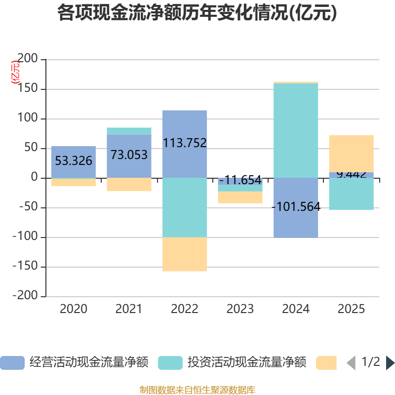截至2025年,公司经营活动现金流净额为9.44亿元,同比增加111.01亿元;筹资活动现金流净额62.31亿元,同比增加59.76亿元;投资活动现金流净额-54.26亿元,上年同期为159.56亿元。