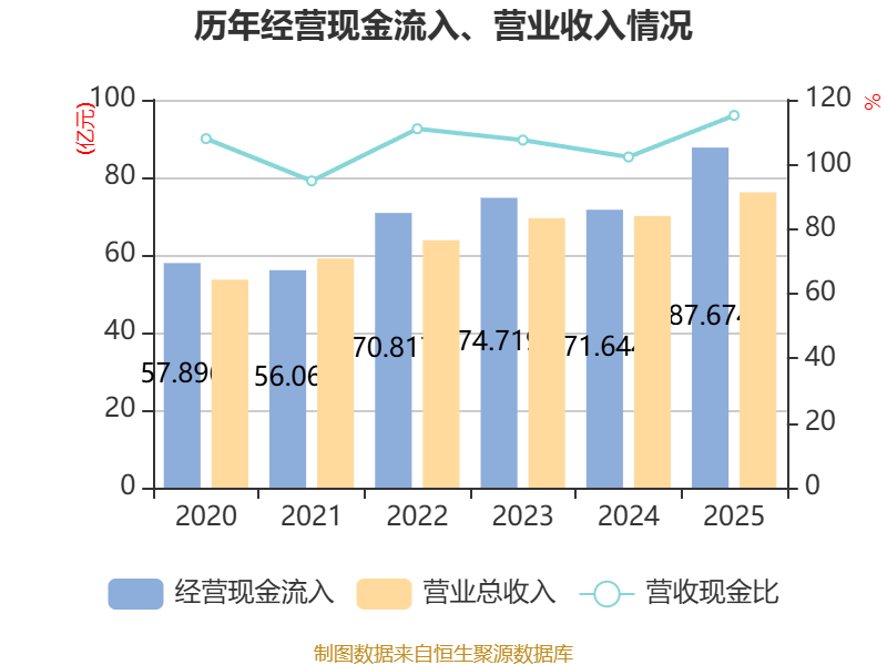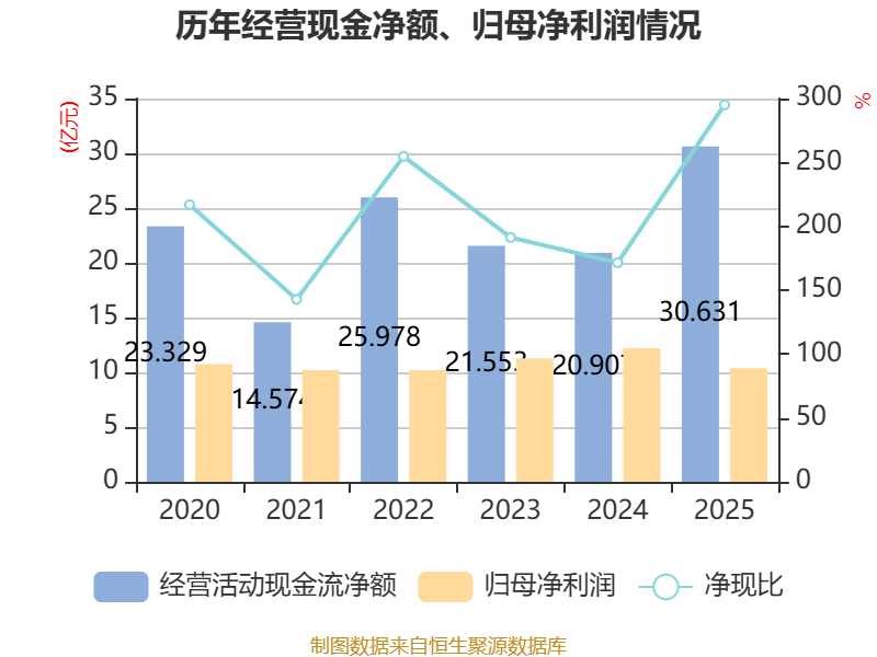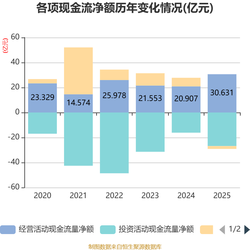 截至2025年,公司经营活动现金流净额为30.63亿元,同比增长46.51%;筹资活动现金流净额-2.29亿元,同比减少9.15亿元;投资活动现金流净额-26.85亿元,上年同期为-16.14亿元。