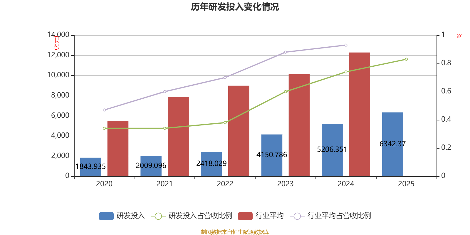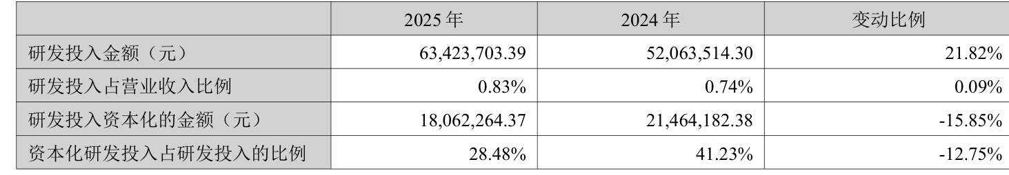 2025年全年,公司研发投入金额为6342.37万元,同比增长21.82%;研发投入占营业收入比例为0.83%,相比上年同期上升0.09个百分点。此外,公司全年研发投入资本化率为28.48%。