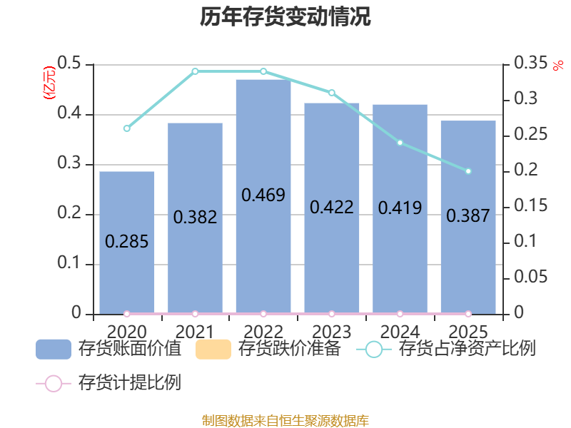 从存货变动来看,截至2025年末,公司存货账面价值为3868.65万元,占净资产的0.2%,较上年末减少320.72万元。公司本期没有计提存货跌价准备。